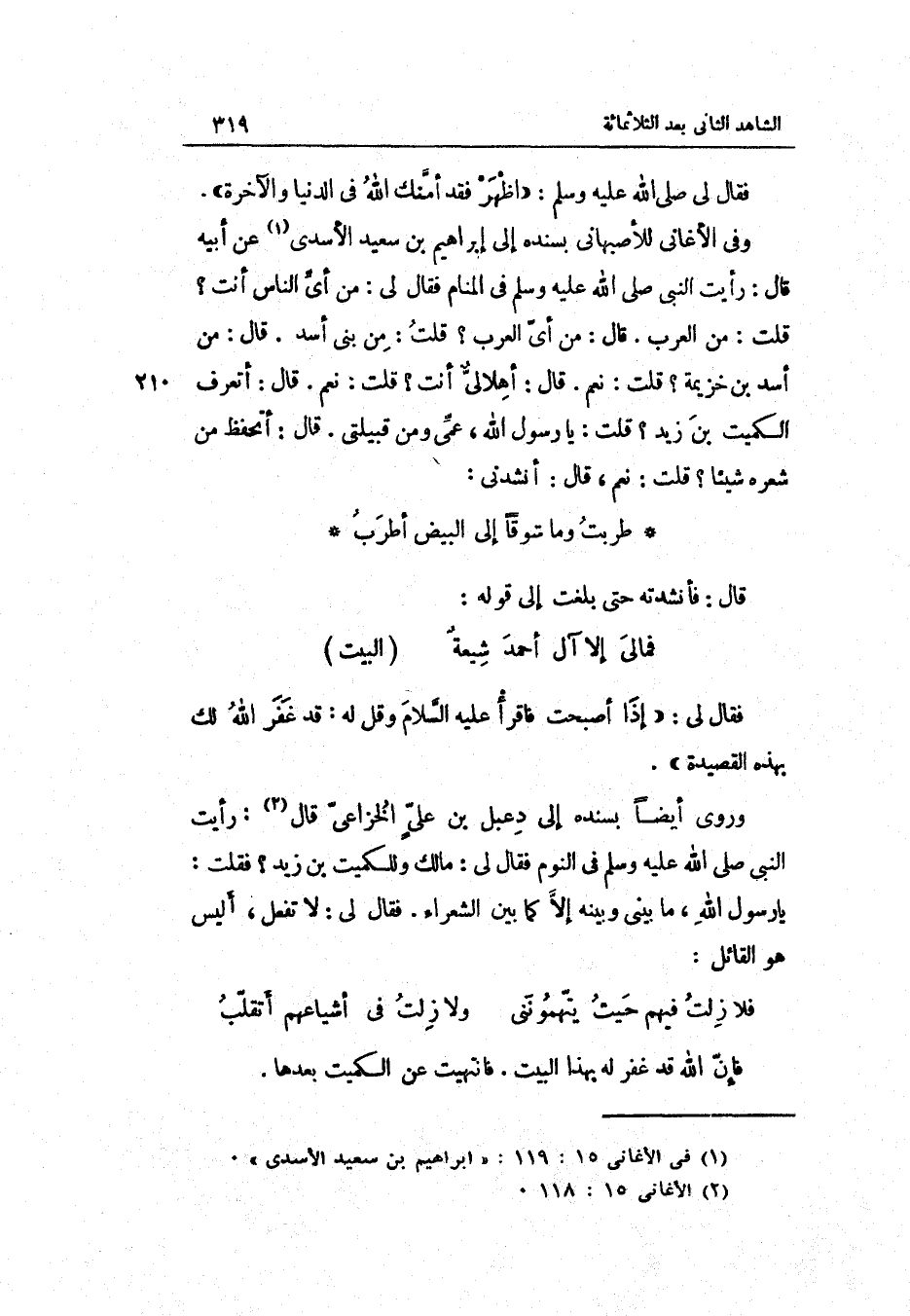 وروى أَيْضا بِسَنَدِهِ إِلَى دعبل بن عليّ الخزاعيّ قَالَ: رَأَيْت النّبيّ صلّى الله عَلَيْهِ وسلّم فِي النّوم فَقَالَ لي: مَالك وللكميت بِمَ زيد فَقلت: يَا رَسُول الله مَا بيني وَبَينه إلاّ كَمَا بَين الشُّعَرَاء. فَقَالَ لي: لَا تفعل أَلَيْسَ هُوَ الْقَائِل: