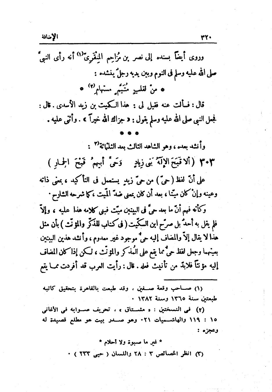وروى أَيْضا بِسَنَدِهِ إِلَى نصر بن مُزَاحم المنقريّ أَنه رأى النّبيّ صلّى الله عَلَيْهِ وسلّم فِي النّوم وَبَين يَدَيْهِ رجلٌ ينشده: الْخَفِيف من لقلبٍ متيّمٍ مستهام قَالَ: فَسَأَلت عَنهُ فَقيل لي: هَذَا الْكُمَيْت بن زيد الأسديّ. قَالَ: فَجعل النّبيّ صلّى الله عَلَيْهِ وسلّم يَقُول: جَزَاك الله خيرا. وَأثْنى عَلَيْهِ.