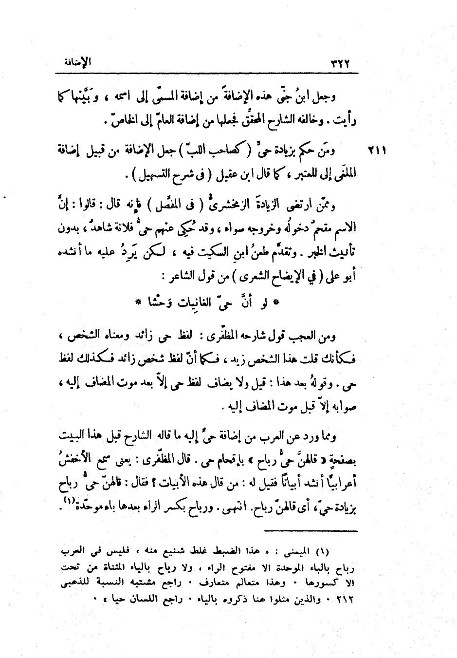 ومّمن ارتضى الزِّيَادَة الزمخشريّ فِي المفصّل فَإِنَّهُ قَالَ: قَالُوا: إنّ الِاسْم مقحمٌ دُخُوله وَخُرُوجه سَوَاء وَقد حُكيَ عَنْهُم حيّ فُلَانَة شاهدٌ بِدُونِ تَأْنِيث الْخَبَر. وتقدّم طعن ابْن السّكيت فِيهِ لَكِن يرد عَلَيْهِ مَا أنْشدهُ أَبُو عَليّ فِي الْإِيضَاح الشعريّ من قَول الشَّاعِر: لَو أنّ حَيّ الغانيات وحشا وَمن الْعجب قَول شَارِحه المظفّري: لفظ حيّ زَائِد وَمَعْنَاهُ الشَّخْص فكأنك قلت: هَذَا الشَّخْص زيد فَكَمَا أنّ لفظ شخص زَائِد فَكَذَلِك لفظ حيّ. وَقَوله بعد هَذَا: قيل وَلَا يُضَاف لفظ حيّ إلاّ بعد موت الْمُضَاف إِلَيْهِ صَوَابه إلاّ قبل موت الْمُضَاف إِلَيْهِ.
