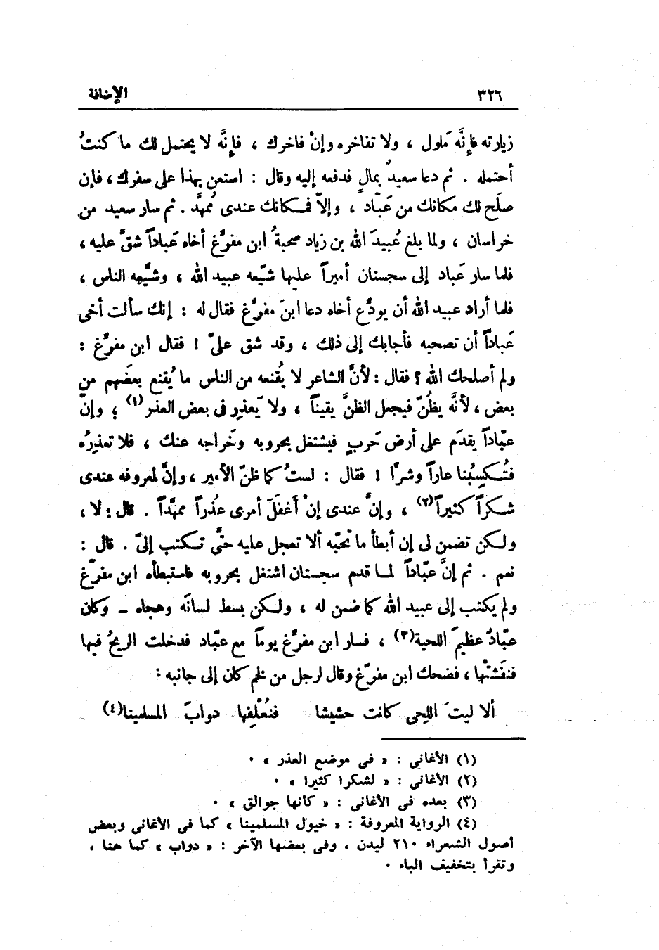 ثمَّ دَعَا سعيدٌ بِمَال فَدفعهُ إِلَيْهِ وَقَالَ: اسْتَعِنْ بِهَذَا على سفرك فَإِن صلح لَك مَكَانك من عبّاد وإلاّ فمكانك عِنْدِي ممهّد. ثمَّ سَار سعيد من خُرَاسَان وَلما بلغ عبيد الله بن زِيَاد صُحْبَة ابْن مفرّغ أَخَاهُ عباداً شقّ عَلَيْهِ فَلَمَّا سَار عبّاد إِلَى سجستان أَمِيرا عَلَيْهَا شيّعه عبيد الله وشيّعه النَّاس فَلَمَّا أَرَادَ عبيد الله أَن يودّع أَخَاهُ دَعَا ابْن مفرّغ فَقَالَ لَهُ: إنّك سَأَلت أخي عباداً أَن تصحبه فأجابك إِلَى ذَلِك وَقد شقّ عليّ فَقَالَ ابْن مفرّغ: وَلم أصلحك الله فَقَالَ: لأنّ الشَّاعِر لَا يقنعه من النَّاس مَا يقنع بَعضهم من بعض لِأَنَّهُ يظنّ فَيجْعَل الظنّ يَقِينا وَلَا يعْذر فِي بعض الْعذر وإنّ عبّاداً يقدم على أَرض حربٍ فيشتغل بحروبه وخراجه عَنْك فَلَا تعذره فتكسبنا عاراً وشرّاً فَقَالَ: لست كَمَا ظنّ الْأَمِير وإنّ لمعروفه عِنْدِي شكرا كثيرا وإنّ عِنْدِي إِن أغفل أَمْرِي عذرا ممهّداً. قَالَ: لَا وَلَكِن تضمن لي إِن أَبْطَأَ عَنْك مَا تحبّه أَلا تعجل عَلَيْهِ حتّى تكْتب إليّ. قَالَ: ثمَّ لإنّ عبّاداً لما قدم سجستان اشْتغل بحروبه فاستبطأه ابْن مفرّغ وَلم يكْتب إِلَى عبيد الله كَمَا ضمن لَهُ وَلَكِن بسط لِسَانه وهجاه وَكَانَ عبّادٌ عَظِيم اللِّحْيَة فسارا ابْن مفرّغ يَوْمًا مَعَ عبّاد فَدخلت الرّيح فِيهَا فنفشتها فَضَحِك ابْن مفرّغ وَقَالَ لرجل من لخم كَانَ إِلَى جَانِبه: الوافر