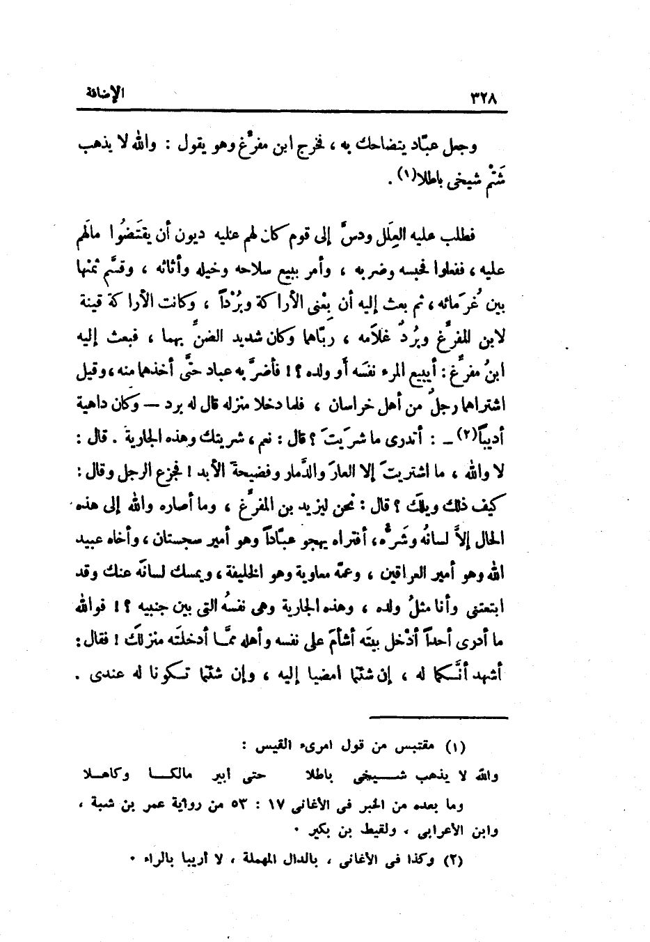 فَطلب عَلَيْهِ الْعِلَل ودسّ إِلَى قوم كَانَ لَهُم عَلَيْهِ ديوَان أَن يقتضوا مَالهم عَلَيْهِ فَفَعَلُوا فحبسه وضربه وَأمر بِبيع سلاحه وخيله وأثاثه وقسّم ثمنهَا بَين غُرَمَائه ثمَّ بعث إِلَيْهِ أَن بِعني الأراكة وبرداً وَكَانَت الأراكة قينة لِابْنِ المفرّغ وبردٌ غُلَامه ربّاهما وَكَانَ شَدِيد الضنّ بهما فَبعث إِلَيْهِ ابْن مفرّغ: أيبيع الْمَرْء نَفسه أَو لده
