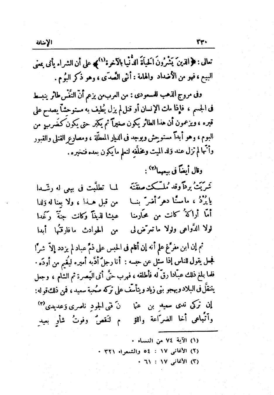 وَفِي مروج الذَّهَب للمسعوديّ: من الْعَرَب من يزْعم أنّ النّفس طَائِر ينبسط فِي الْجِسْم فَإِذا مَاتَ الْإِنْسَان أَو قتل لم يزل يطِيف بِهِ مستوحشاً يصدح على قَبره