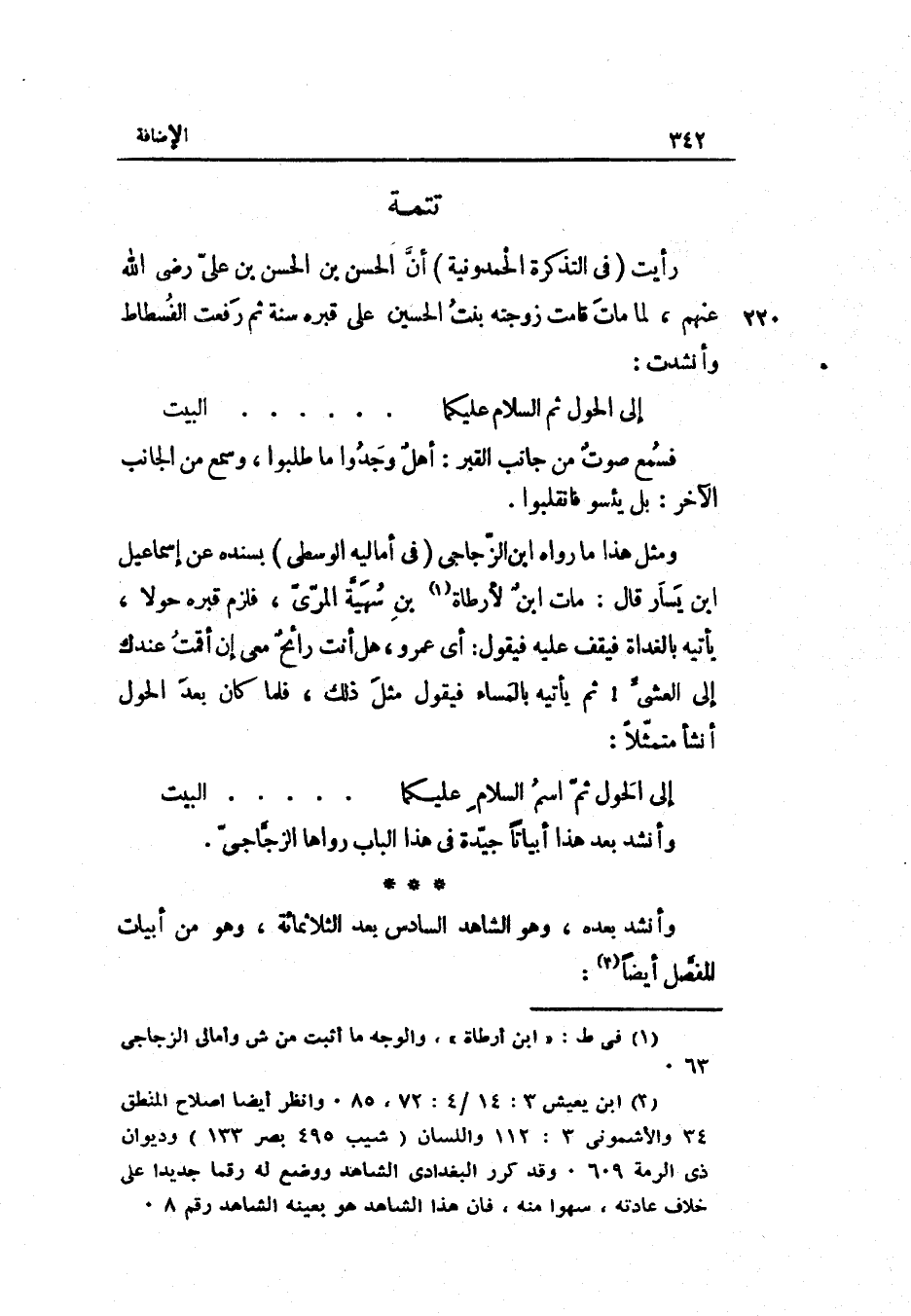 تَتِمَّة رَأَيْت فِي التَّذْكِرَة الحمدونية أنّ الْحسن ابْن الْحسن بن عليّ رَضِيَ اللَّهُ عَنْهم لما مَاتَ قَامَت زَوجته بنت الْحُسَيْن على قَبره سنة ثمَّ رفعت الْفسْطَاط وأنشدت: إِلَى الْحول ثمنّ السّلام عَلَيْكُمَا ... ... ... الْبَيْت فَسمع صوتٌ من جَانب الْقَبْر: أهلٌ وجدوا مَا طلبُوا وَسمع من الْجَانِب الآخر: بل يئسوا فانقلبوا.
