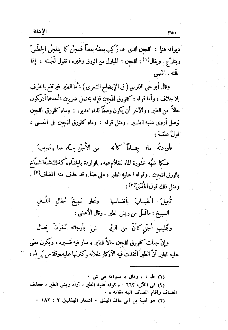 وَقَالَ أَبُو عليّ الفارسيّ فِي الْإِيضَاح الشعريّ: أما الطير فيرتفع بلظرف بِلَا خلاف وَأما قَوْله: كالورق اللّجين فإنّه يحْتَمل ضَرْبَيْنِ:)