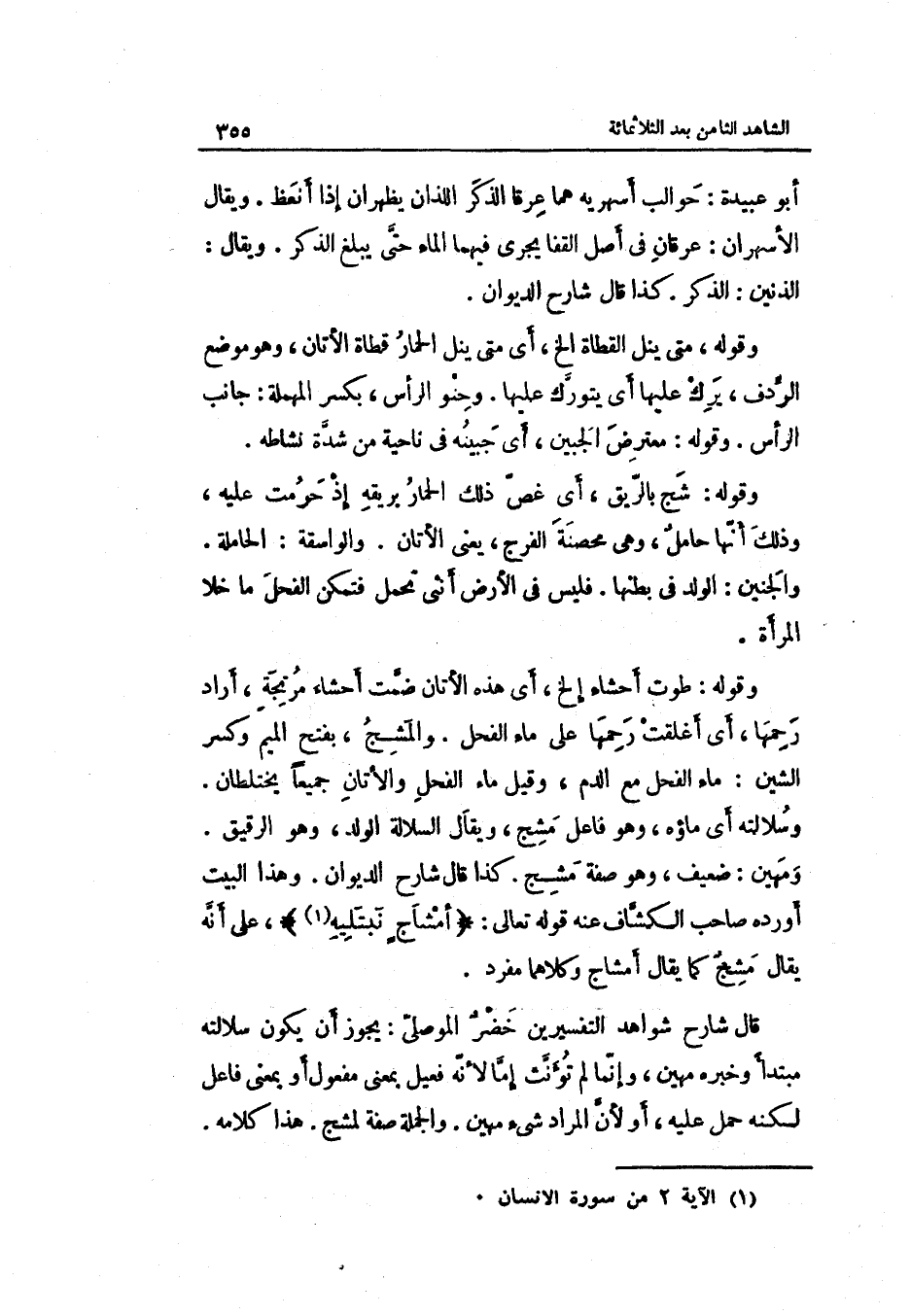 كَذَا قَالَ شَارِح الدِّيوَان. وَهَذَا الْبَيْت أوردهُ صَاحب الكشّاف عَنهُ قَوْله تَعَالَى: أمشاجٍ نبتليه على أنّه يُقَال: مشجٌ كَمَا يُقَال أمشاج وَكِلَاهُمَا مُفْرد.