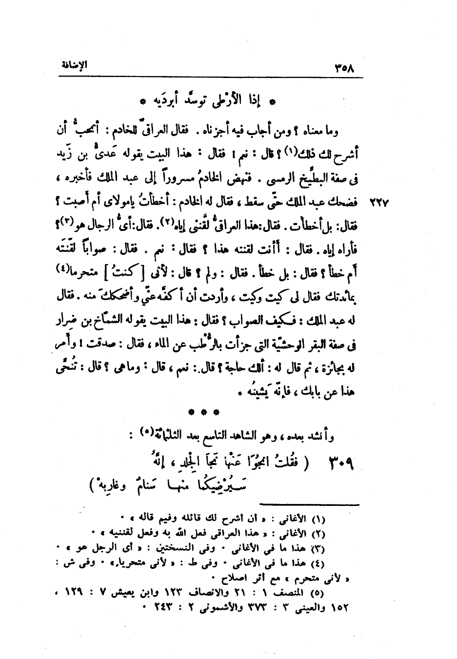 وأضحكك مِنْهُ. فَقَالَ لَهُ عبد الْملك: فَكيف الصَّوَاب فَقَالَ: هَذَا الْبَيْت يَقُوله الشمّاخ بن ضرار فِي صفة الْبَقر الوحشيّة الَّتِي جزأت بالرّطب عَن المَاء فَقَالَ: صدقت وَأمر لَهُ بجائزة ثمَّ وَأنْشد بعده وَهُوَ