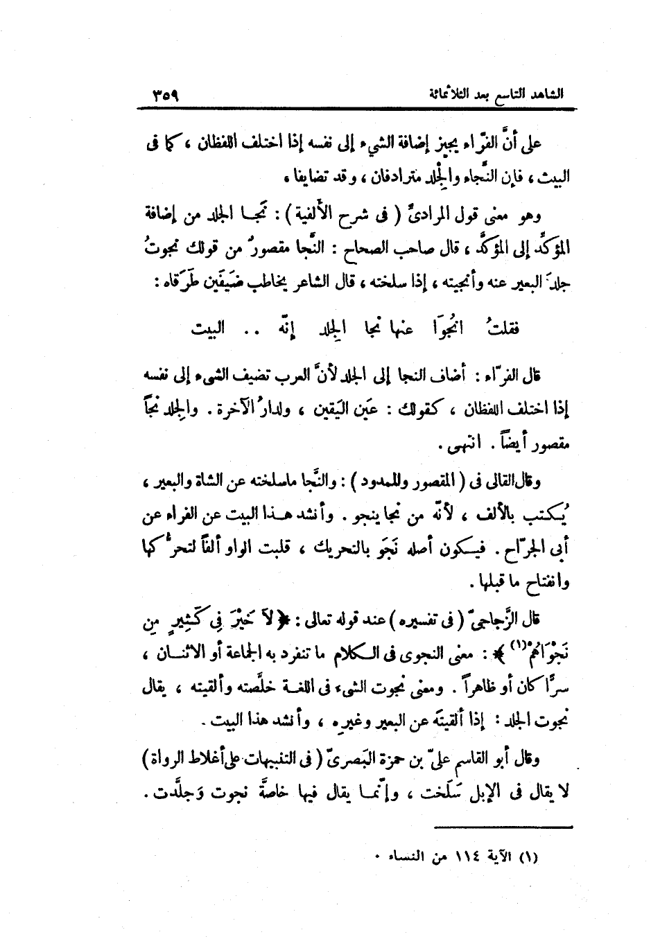 . على أنّ الفرّاء يُجِيز إِضَافَة الشَّيْء إِلَى نَفسه إِذا اخْتلف اللفظان كَمَا فِي الْبَيْت فإنّ النّجاء وَالْجَلد مُتَرَادِفَانِ وَقد تضايقا.