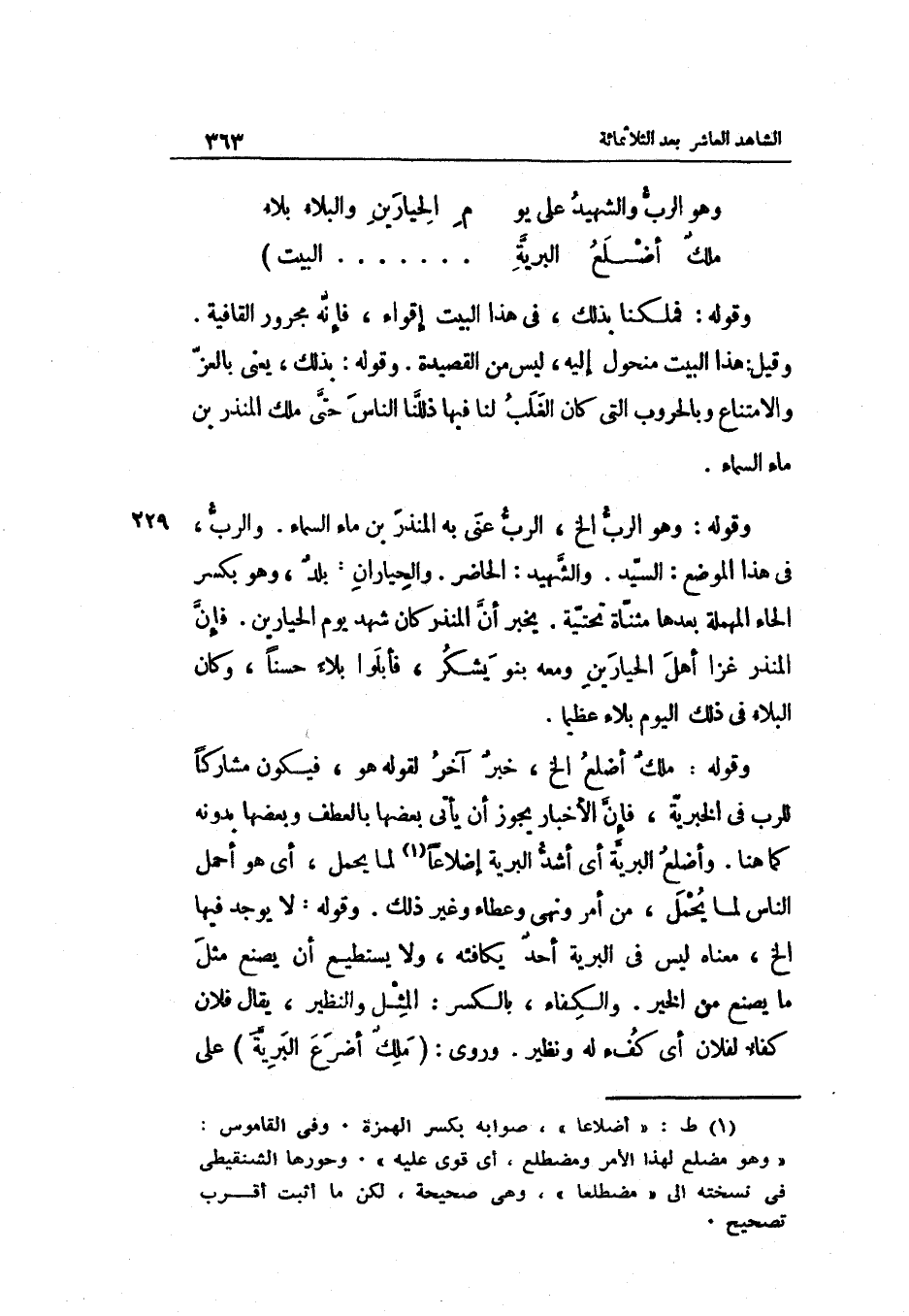 وَقَوله: وَهُوَ الربّ الخ الربّ عَنى بِهِ الْمُنْذر بن مَاء السَّمَاء. والربّ فِي هَذَا الْموضع: السَّيِّد. والشَّهِيد الْحَاضِر. والحياران: بلدٌ وَهُوَ بِكَسْر الْحَاء الْمُهْملَة بعْدهَا مثّناة تحتيّة. يخبر أنّ الْمُنْذر كَانَ شهد يَوْم الحيارين. فإنّ الْمُنْذر غزا أهل الحيارين وَمَعَهُ بَنو يشْكر فأبلوا بلَاء حسنا وَكَانَ الْبلَاء فِي ذَلِك الْيَوْم بلَاء عَظِيما.
