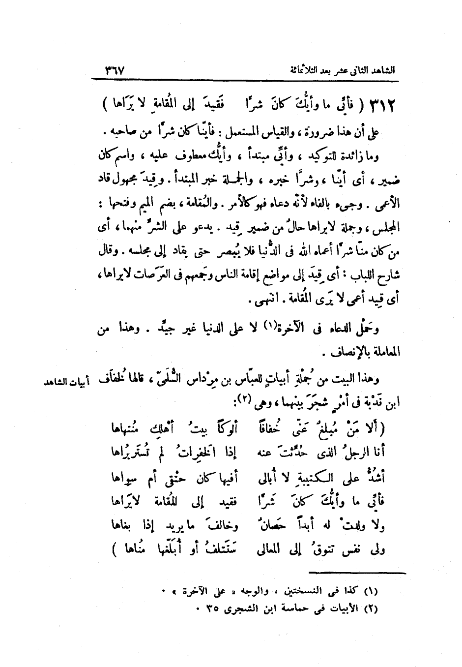 على أَن هَذَا ضَرُورَة وَالْقِيَاس الْمُسْتَعْمل: فأيّناكان شرّاً من صَاحبه. ومَا زَائِدَة للتوكيد وأيّي مُبْتَدأ وأيّك مَعْطُوف عَلَيْهِ وَاسم كَانَ ضمير أَي: أيّنا وشرّاً خَبره وَالْجُمْلَة خبر الْمُبْتَدَأ وقيد مَجْهُول قاد الْأَعْمَى. وَجِيء بِالْفَاءِ لأنّه دُعَاء فَهُوَ كالأمر.