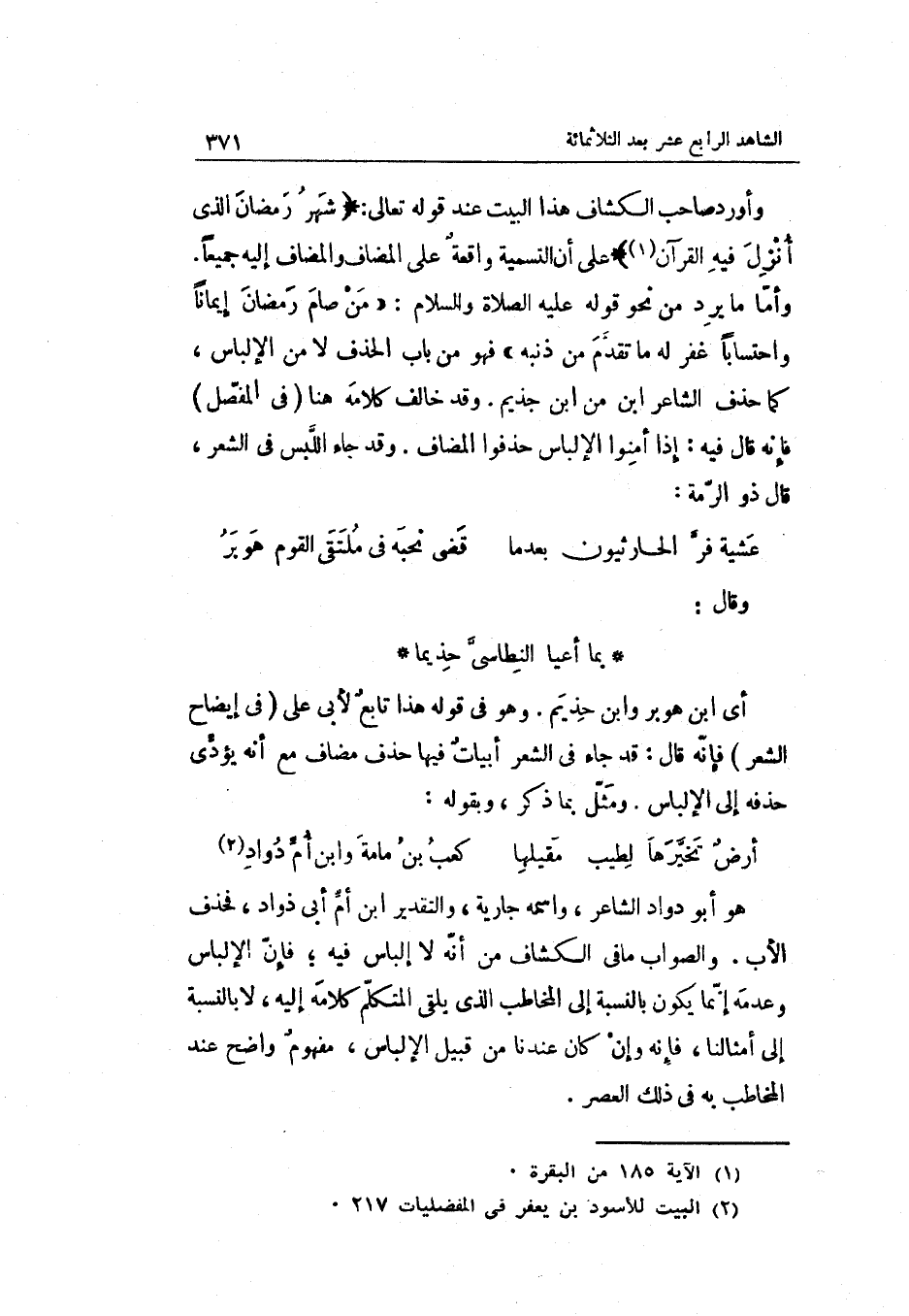 وَأورد صَاحب الْكَشَّاف هَذَا الْبَيْت عِنْد قَوْله تَعَالَى: شهر رَمَضَان الَّذِي أنزل فِيهِ الْقُرْآن على أنّ التَّسْمِيَة واقعةٌ على الْمُضَاف والمضاف إِلَيْهِ جَمِيعًا.