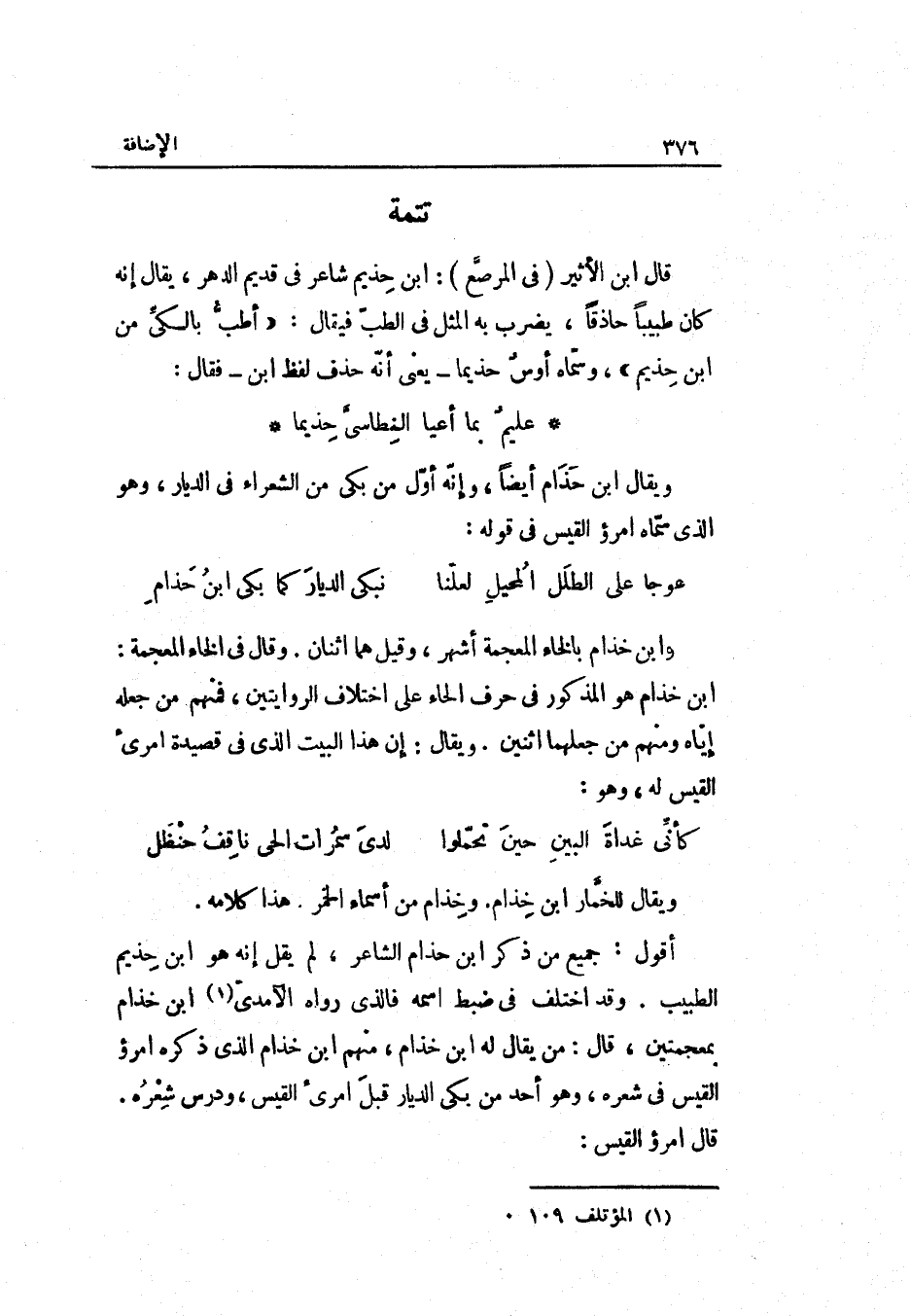 أَقُول: جَمِيع من ذكر ابْن حذام الشَّاعِر لم يقل إِنَّه هُوَ ابْن حذيم الطَّبِيب. وَقد اخْتلف فِي ضبط اسْمه فَالَّذِي رَوَاهُ الْآمِدِيّ ابْن خذام بمعجمتين قَالَ: من يُقَال لَهُ ابْن خذام مِنْهُم ابْن خذام الَّذِي ذكره امْرُؤ الْقَيْس فِي شعره وَهُوَ أحد من بَكَى الديار قبل امْرِئ الْقَيْس ودرس شعره.