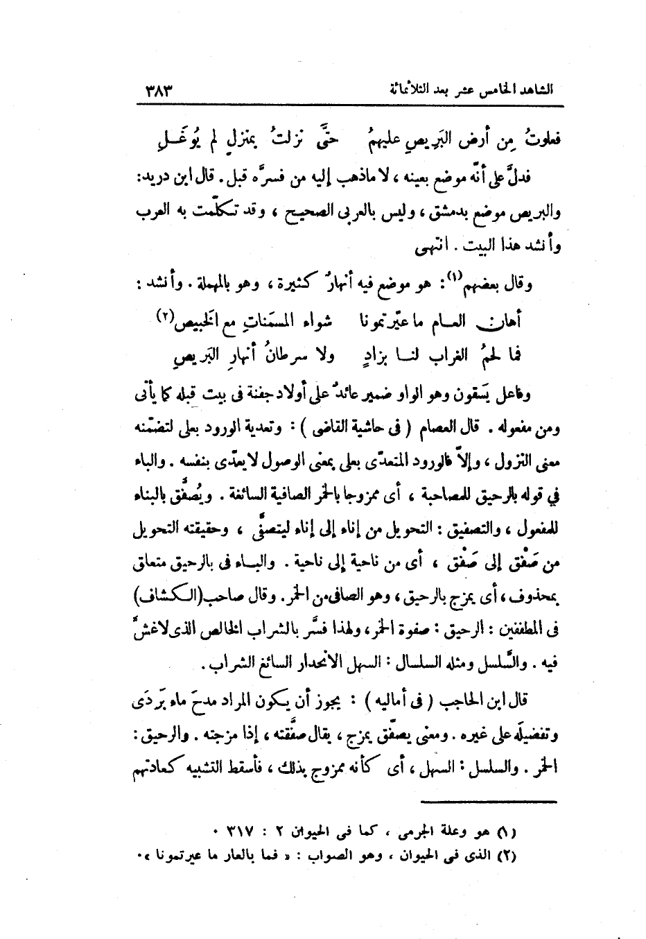قَالَ ابْن حَاجِب فِي أَمَالِيهِ: يجوز أَن يكون المُرَاد مدح مَاء بردى وتفضيله على غَيره. وَمعنى يصفّق يمزج يُقَال صفّقته إِذا مزجته. والرَّحِيق: الْخمر. والسلسل: السهل أَي: كَأَنَّهُ ممزوج
