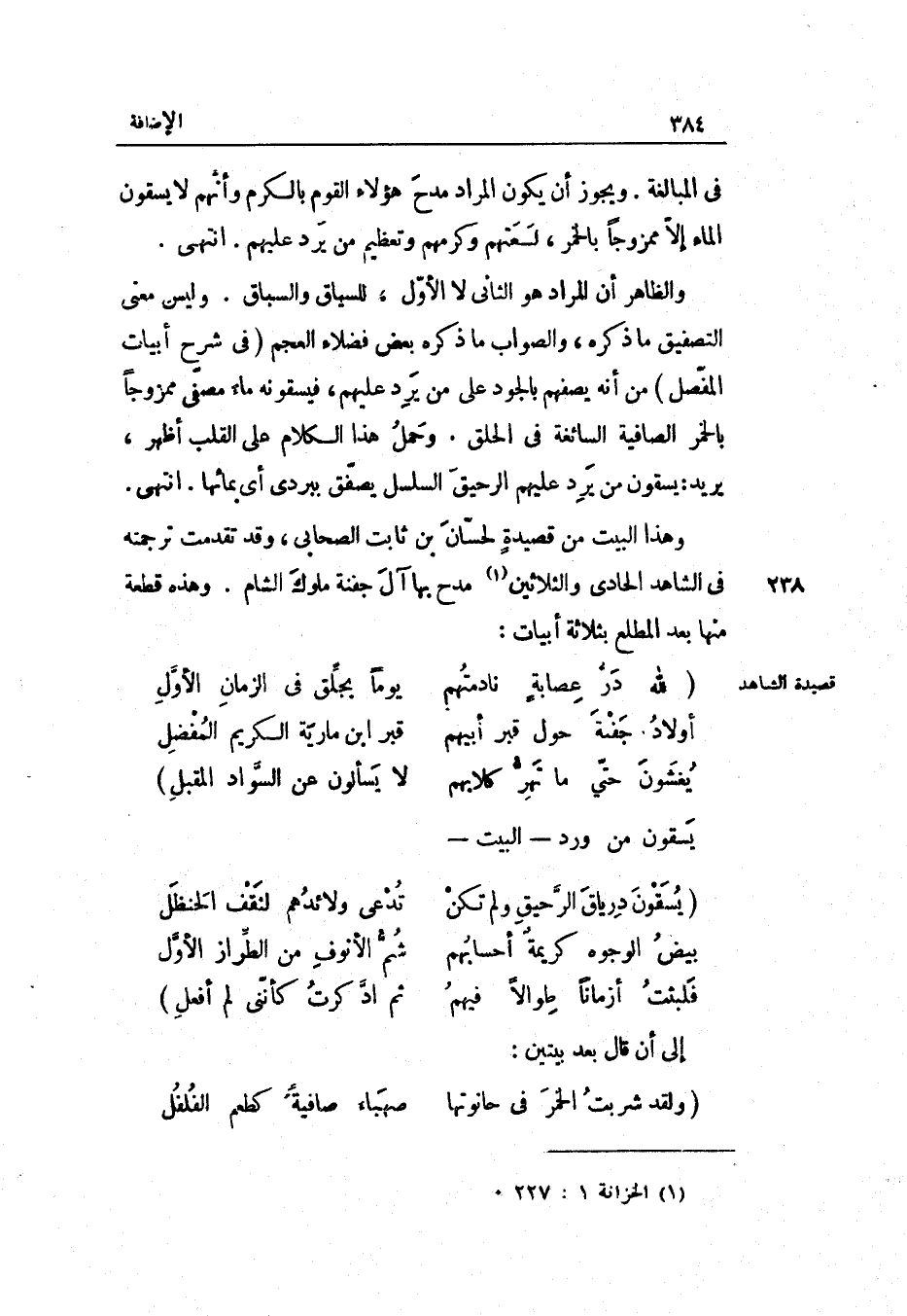 وَالظَّاهِر أنّ المُرَاد هُوَ الثَّانِي لَا الأوّل للسياق والسّباق. وَلَيْسَ معنى التصفيق مَا ذكره وَالصَّوَاب مَا ذكره بعض فضلاء الْعَجم فِي شرح أَبْيَات المفصّل من أَنه يصفهم بالجود على من يرد عَلَيْهِم فيسقونه مَاء مصفّى ممزوجاً بِالْخمرِ الصافية السائغة فِي الْحلق.