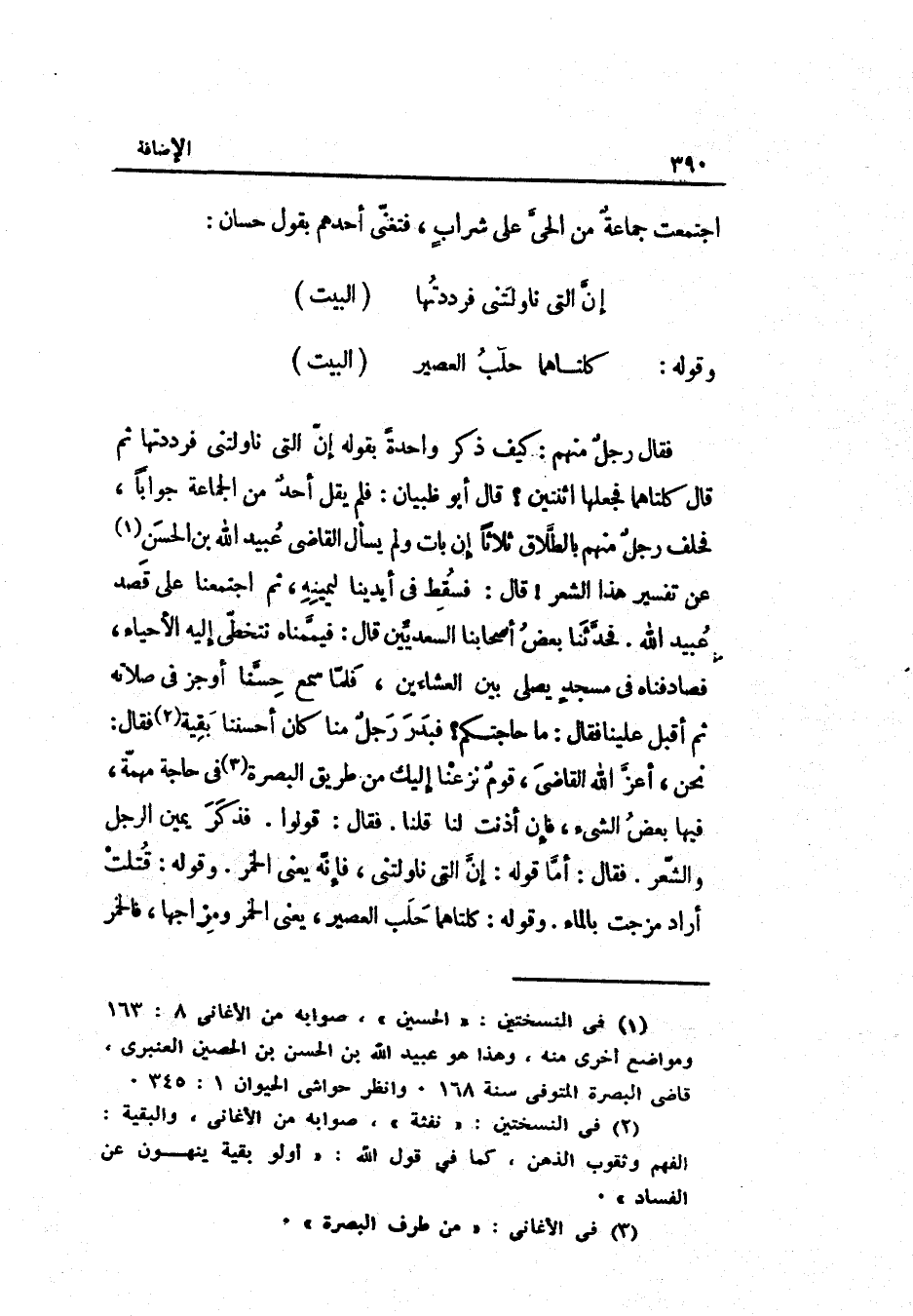 اجْتمعت جماعةٌ من الحيّ على شرابٍ فتغنّى أحدهم بقول حسّان: إنّ الَّتِي ناولتني فَردَّتهَا الْبَيْت وَقَوله: كلتاهما حلب الْعصير الْبَيْت فَقَالَ رجلٌ مِنْهُم: كَيفَ ذكر واحدةٌ بقوله إنّ الَّتِي ناولتني فرددتها ثمَّ قَالَ كلتاهما فَجَعلهَا اثْنَتَيْنِ قَالَ أَبُو ظبْيَان: فَلم يقل أحدٌ من الْجَمَاعَة جَوَابا فَحلف رجلٌ مِنْهُم بِالطَّلَاق ثَلَاثًا إِن بَات وَلم يسْأَل القَاضِي عبد الله بن الْحسن عَن تَفْسِير