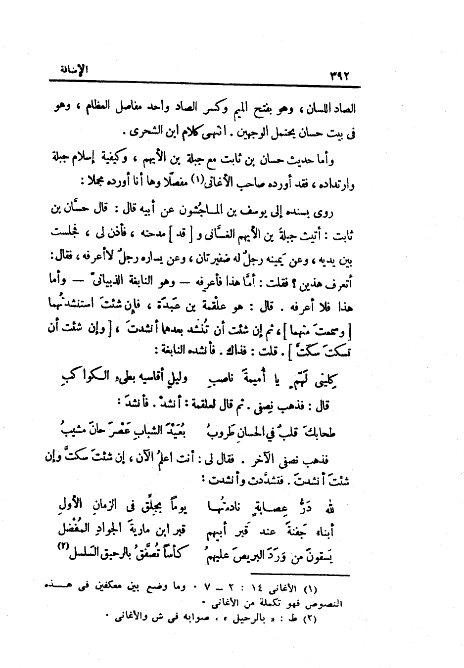 وَأما حَدِيث حسان بن ثَابت مَعَ جبلة بن الْأَيْهَم وَكَيْفِيَّة إِسْلَام جبلة وارتداده فقد أوردهُ صَاحب الأغاني مفصّلاً وَهَا أَنا أوردهُ مُجملا: روى بِسَنَدِهِ إِلَى يُوسُف بن الْمَاجشون عَن أَبِيه قَالَ: قَالَ حسّان بن ثَابت: أتيت جبلة بن الْأَيْهَم الغسّاني وقد مدحته فَأذن لي فَجَلَست بَين يَدَيْهِ وَعَن يَمِينه رجلٌ لَهُ ضفيرتان وَعَن يسَاره رجلٌ لَا أعرفهُ فَقَالَ: أتعرف هذَيْن فَقلت: أمّا هَذَا فأعرفه وَهُوَ النَّابِغَة الذبيانيّ وَأما هَذَا فَلَا أعرفهُ. قَالَ: هُوَ عَلْقَمَة بن عَبدة فَإِن شِئْت استشدتهما وَسمعت مِنْهُمَا ثمَّ إِن شِئْت أَن تنشد بعدهمَا أنشدت وَإِن شِئْت أَن تسكت سكتّ. قلت: فَذَاك. فأنشده النَّابِغَة: الطَّوِيل