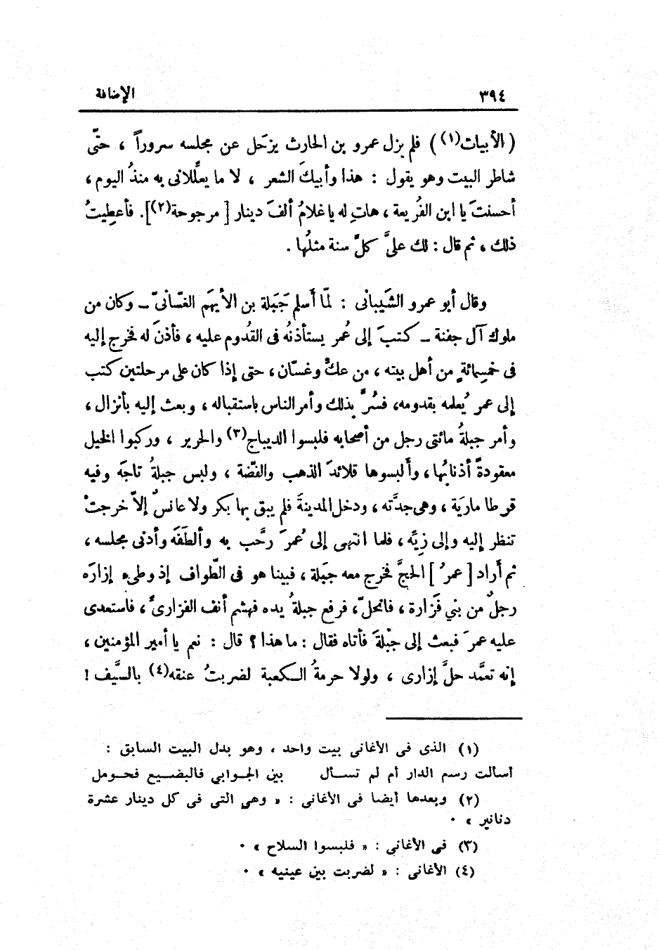 الأبيات فَلم يزل عَمْرو بن الْحَارِث يزحل عَن مَجْلِسه سُرُورًا حتّى شاطر الْبَيْت وَهُوَ يَقُول: هَذَا وَأَبِيك الشّعْر لَا مَا يعلّلاني بِهِ مُنْذُ الْيَوْم هَذِه وَالله البتّارة الَّتِي قد بترت المدائح أَحْسَنت يَا ابْن الفريعة هَات لَهُ يَا غُلَام ألف دِينَار مرجوحة. فَأعْطيت ذَلِك ثمَّ قَالَ: لَك عليّ كلّ وَقَالَ أَبُو عَمْرو الشّيبانيّ: لّما أسلم جبلة بن الْأَيْهَم الغسّانيّ وَكَانَ من مُلُوك آل جَفْنَة كتب إلأى عمر يَسْتَأْذِنهُ فِي الْقدوم عَلَيْهِ فَأذن لَهُ فَخرج إِلَيْهِ فِي خمسمائةٍ من أهل بَيته من عكّ وغسّان حَتَّى إِذا كَانَ على مرحلَتَيْنِ كتب إلأى عمر يُعلمهُ بقدومه فسرّ عمر رضوَان الله عَلَيْهِ بذلك)