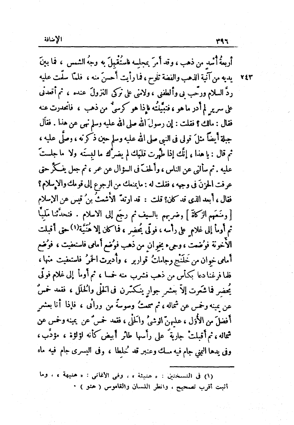 عَلَيْهِ ردّ السَّلَام ورحبّ بِي الطفني ولامني على تركي النُّزُول عِنْده ثمَّ أقعدني على سَرِير لم ادر مَا هُوَ فتبينته فَإِذا هُوَ كرسيٌّ من ذهب فانحدرت عَنهُ فَقَالَ: مَالك فَقلت: إِن رَسُول الله صلّى الله عَلَيْهِ وسلّم نهى عَن هَذَا.