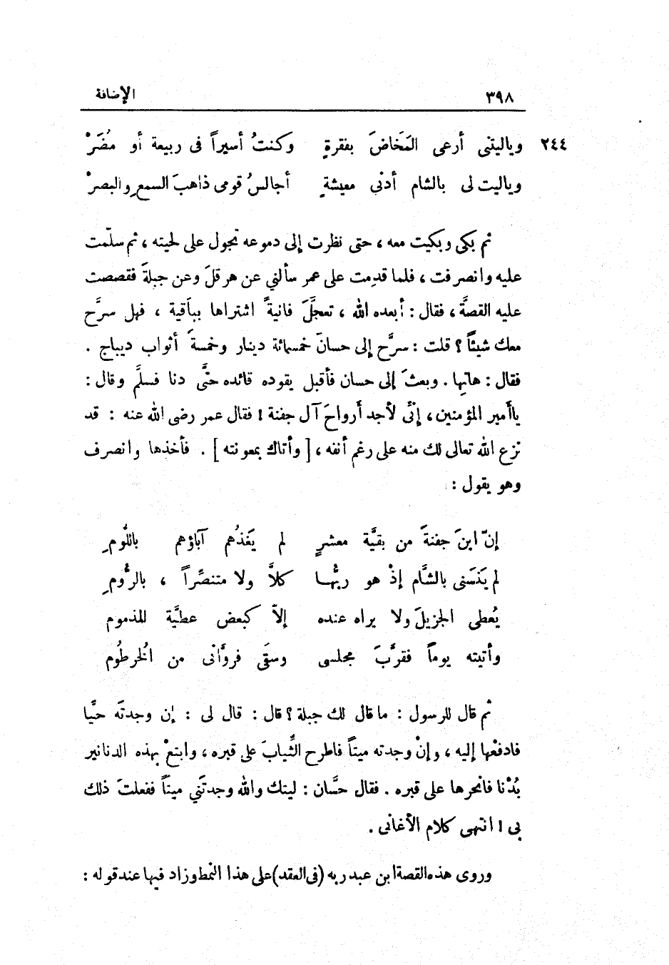ثمَّ بَكَى وبكيت مَعَه حتّى نظرت إِلَى دُمُوعه تجول على لحيته كَأَنَّهَا اللُّؤْلُؤ ثمَّ سلّمت عَلَيْهِ وانصرفت فَلَمَّا قدمت على عمر سَأَلَني عَن هِرقل وَعَن جبلة فقصصت عَلَيْهِ القصّة فَقَالَ: أبعده الله تعجّل فانيةً اشْتَرَاهَا بباقية فَهَل سرّح مَعَك شَيْئا قلت: سرّح إِلَى حسان خَمْسمِائَة دِينَار وَخَمْسَة أَثوَاب ديباج. فَقَالَ: هَاتِهَا.