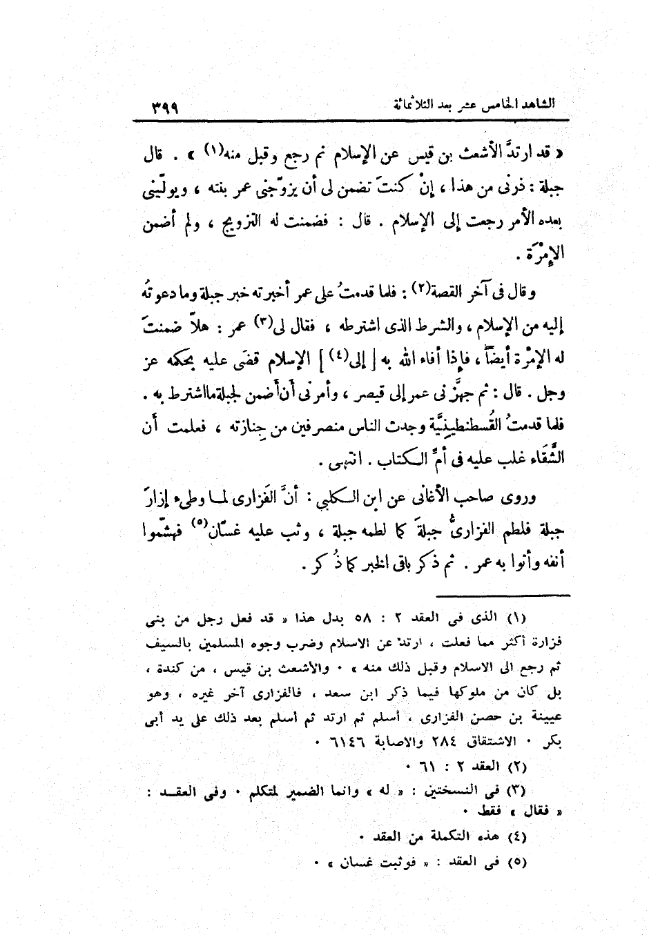 وروى صَاحب الأغاني عَن ابْن الْكَلْبِيّ: أنّ الفزاريّ لما وطئ إِزَار جبلة فلطم الفزاريّ جبلة كَمَا لطمه جبلة وثب عَلَيْهِ غسّان فهشّموا أَنفه وَأتوا بِهِ عمر. ثمَّ ذكر بَاقِي الْخَبَر كَمَا ذكر.