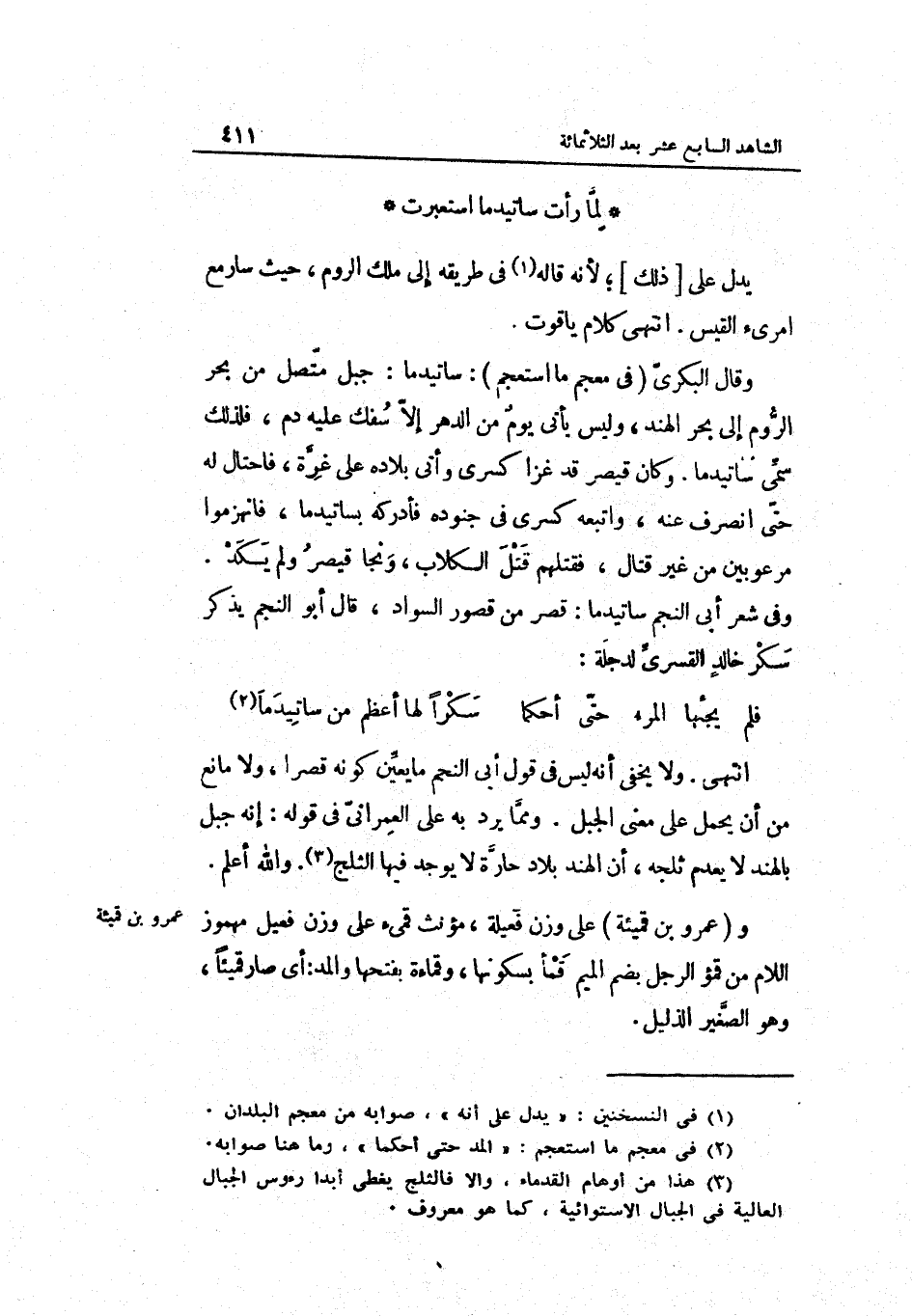 لّما رَأَتْ ساتيدما استعبرت يدل على ذَلِك لِأَنَّهُ قَالَه فِي طَرِيقه إِلَى ملك الرّوم حَيْثُ سَار مَعَ امْرِئ الْقَيْس. انْتهى كَلَام وَقَالَ البكريّ فِي مُعْجم مَا استعجم: ساتيدما: جبل متّصل من بَحر الرّوم إِلَى بَحر الْهِنْد وَلَيْسَ يَأْتِي يومٌ من الدَّهْر إلاّ سفك عَلَيْهِ دم فَلذَلِك سمّي ساتيدما. وَكَانَ قَيْصر قد غزا كسْرَى وأتى بِلَاده على غرّة فاحتال لَهُ حتّى انْصَرف عَنهُ وَاتبعهُ كسْرَى فِي جُنُوده فأدركه بساتيدما فَانْهَزَمُوا مرعوبين من غير قتال فَقَتلهُمْ قتل الْكلاب وَنَجَا قَيْصر وَلم يكد. وَفِي شعر)