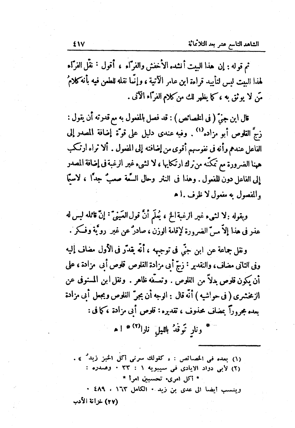 وَنقل جمَاعَة عَن ابْن جنّي فِي تَوْجِيهه: أنّه يقدّر فِي الأول مُضَاف إِلَيْهِ وَفِي الثَّانِي مُضَاف وَالتَّقْدِير: زجّ أبي مزاده القلوص قلُوص أبي مزادة على أَن يكون قلُوص بَدَلا من القوص وتعسّفه ظَاهر. وَنقل ابْن الْمُسْتَوْفى عَن الزمخشريّ فِي حَوَاشِيه أنّه قَالَ: الْوَجْه أَن يجرّ القلوص وَيجْعَل أبي مزادة بعده مجروراً بمضاف مَحْذُوف تَقْدِيره: قلُوص أبي مزادة كَمَا فِي: المتقارب