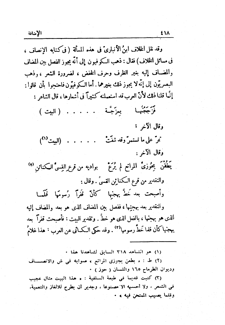 وَقد نقل الْخلاف ابْن الأنباريّ فِي هَذِه الْمَسْأَلَة فِي كِتَابه الْإِنْصَاف فِي مسَائِل الْخلاف فَقَالَ: ذهب الكوفيّون إِلَى أنّه يجوز الْفَصْل بَين الْمُضَاف والمضاف إِلَيْهِ بِغَيْر الظّرْف وحرف الْخَفْض لضَرُورَة الشّعْر وَذهب البصريّون إِلَى أنّه لَا يجوز ذَلِك بِغَيْرِهِمَا. أما الكوفيّون فاحتجوا بِأَن فزججتها بمزجةٍ ... ... ... . الْبَيْت وَقَالَ الآخر: تمرّ على مَا تستمرّ وَقد شفت ... ... ... . الْبَيْت وَقَالَ الآخر: الطَّوِيل