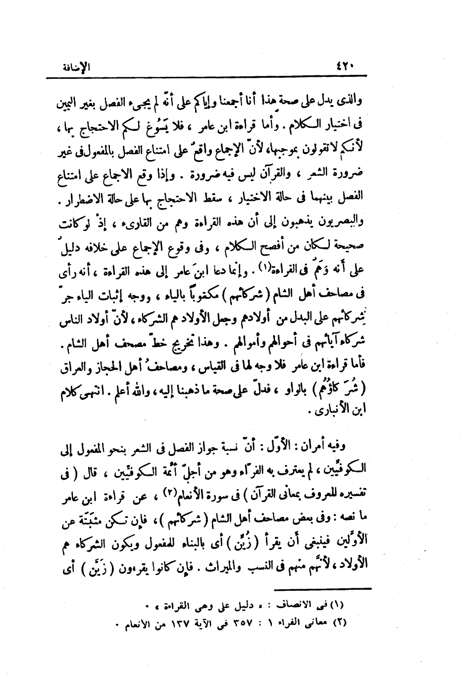 وَفِيه أَمْرَانِ: الأول: أنّ نسبه جَوَاز الْفَصْل فِي الشّعْر بِنَحْوِ الْمَفْعُول إِلَى الكوفيّين لم يعْتَرف بِهِ الفرّاء وَهُوَ من أجلّ أَئِمَّة الكوفيّين قَالَ فِي تَفْسِيره الْمَعْرُوف بعاني الْقُرْآن: فِي سُورَة الأانعام عِنْد قفراءة ابْن عَامر مَا نَصه: وَفِي بعض مصاحف أهل الشَّام شركائهم فَإِن تكن مثبتة عَن الأوّلين فَيَنْبَغِي أَن يقْرَأ زيّن أَي: بِالْبِنَاءِ للْمَفْعُول وَيكون اللشركاء هم الْأَوْلَاد لأنّهم مِنْهُم فِي النّسَب وَالْمِيرَاث.)