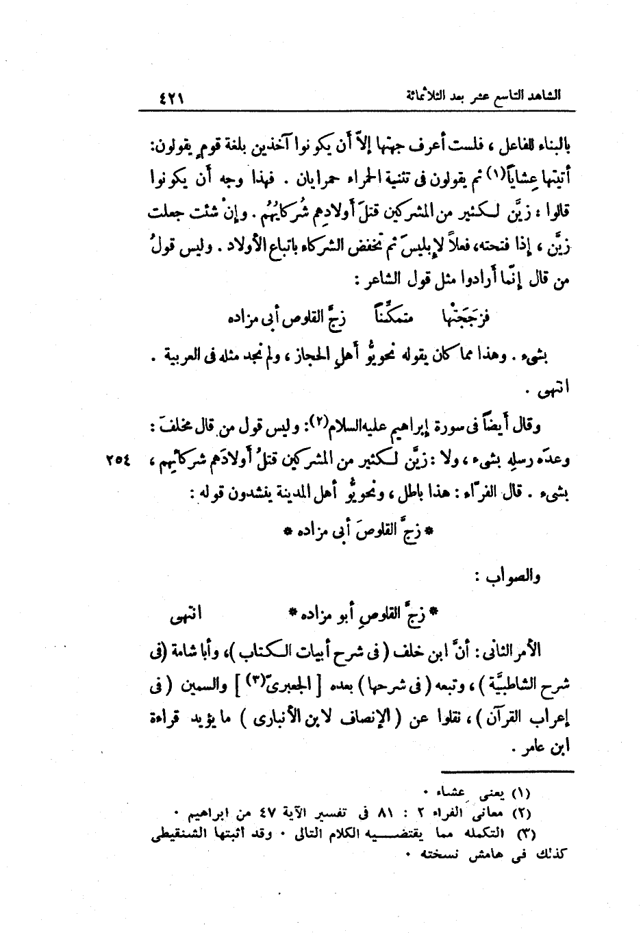 وَقَالَ أَيْضا فِي سُورَة إِبْرَاهِيم عَلَيْهِ السَّلَام: وَلَيْسَ قَول من قَالَ: مخلف وعده رسله بِشَيْء وَلَا: زيّن لكثير من الْمُشْركين قتل أَوْلَادهم شركائهم بِشَيْء. قَالَ الفرّاء: هَذَا بَاطِل ونحويّو أهل الْمَدِينَة ينشدون قَوْله: زجّ القلوص أبي يمزاده وَالصَّوَاب: زجّ القلوص أَبُو مزاده انْتهى الْأَمر الثَّانِي: أنّ ابْن خلف فِي شرح أَبْيَات الْكتاب وَأَبا شامة فِي شرح الشاطبيّة وَتَبعهُ فِي شرحها بعده الجعبريّ والسمين فِي إِعْرَاب الْقُرْآن نقلوا عَن الْإِنْصَاف لِابْنِ الأنباريّ مَا يُؤَيّد قِرَاءَة ابْن عَامر.