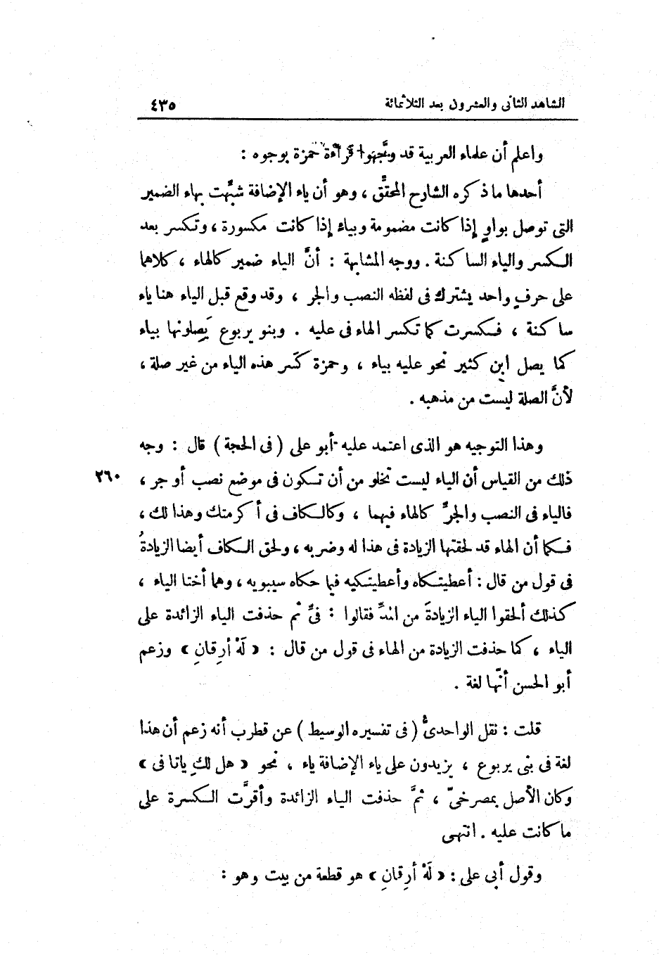 وَاعْلَم أَن عُلَمَاء العربيّة قد وجّهوا قِرَاءَة حَمْزَة بِوُجُوه: أَحدهَا: مَا ذكره الشَّارِح المحقّق وَهُوَ أَن يَاء الْإِضَافَة سشبّهت بهاء الضَّمِير الَّتِي توصل بواوٍ إِذا كَانَت مَضْمُومَة وبياء إِذا كَانَت مَكْسُورَة وتكسر بعد الْكسر وَالْيَاء الساكنة. وَوجه المشابهة: أنّ الْيَاء ضمير كالهاء كِلَاهُمَا على حرف وَاحِد يشْتَرك فِي لَفظه النصب والجر. وَقد وَقع قبل الْيَاء هُنَا يَاء سَاكِنة فَكسرت كَمَا تكسر الْهَاء فِي عَلَيْهِ. وَبَنُو يَرْبُوع يصلونها بياء كَمَا)