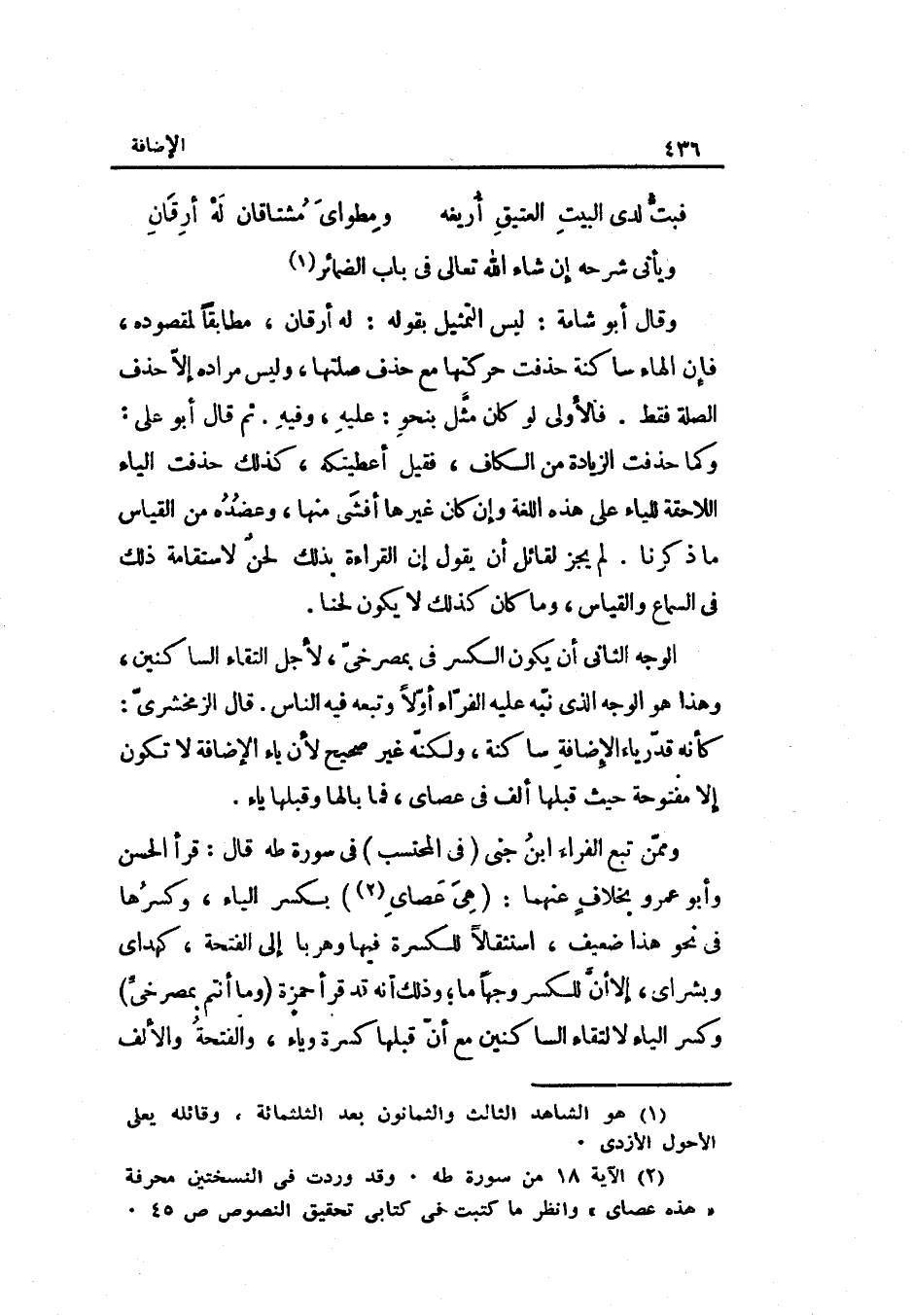 الطَّوِيل فبتّ لَدَى الْبَيْت الْعَتِيق أربغه ومطواي مشتاقان لَهُ أرقان وَيَأْتِي شَرحه إِن شَاءَ الله تَعَالَى فِي بَاب الضمائر.