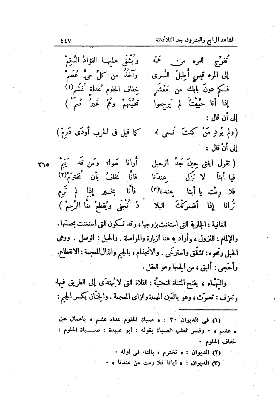 الغانية: الْجَارِيَة الَّتِي استغنت بزوجها وَقد تكون الَّتِي استغنت بحسنها. والْإِلْمَام: النُّزُول وَأَرَادَ بِهِ هُنَا الزِّيَارَة والمواصلة. والْحَبل: الْوَصْل. ووهى الْحَبل وَنَحْوه: تشقّق واسترخى. والانجذام بِالْجِيم والذال الْمُعْجَمَة: الِانْقِطَاع. وأحجى: أليق من الحجا وَهُوَ الْعقل. واليهماء بِفَتْح الْمُثَنَّاة التحتيّة: الفلاة الَّتِي لَا يهتدى إِلَى الطَّرِيق فِيهَا. وتعزف: تصوّت وَهُوَ بِالْعينِ الْمُهْملَة وَالزَّاي الْمُعْجَمَة. والجنّان بِكَسْر الْجِيم: