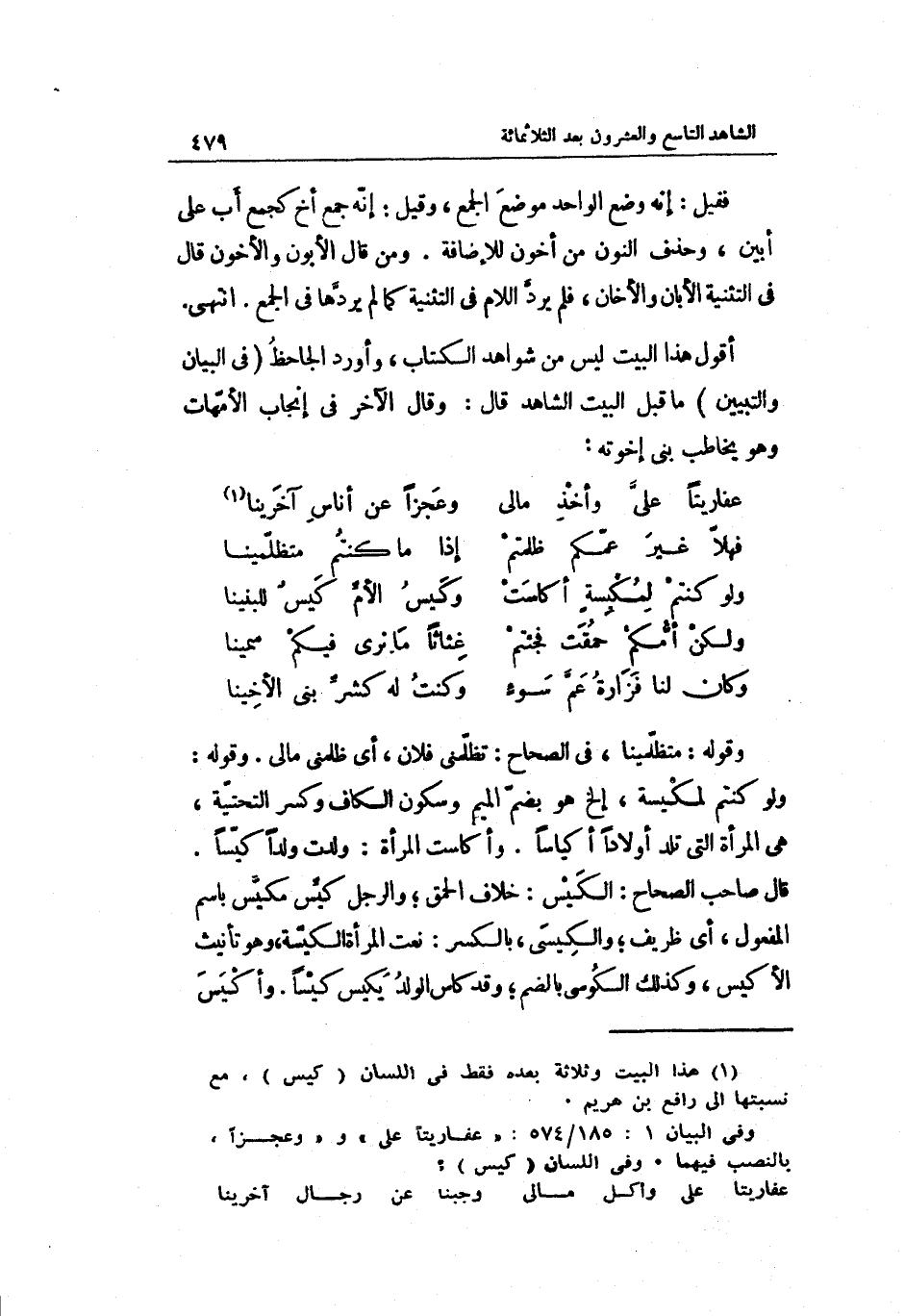 فَقيل: إِنَّه وضع الْوَاحِد مَوضِع الْجمع وَقيل: إنّه جمع أَخ كجمع أَب على أبين وَحذف النُّون من أخون للإضافة. وَمن قَالَ الأبون والأخون قَالَ فِي التَّثْنِيَة الأبان والأخان فَلم يردّ اللَّام فِي التَّثْنِيَة أَقُول هَذَا الْبَيْت لَيْسَ من شَوَاهِد الْكتاب وَأورد الجاحظ فِي الْبَيَان والتبيين مَا قبل الْبَين الشَّاهِد قَالَ: وَقَالَ الآخر فِي إنجاب الأمّهات وَهُوَ يُخَاطب