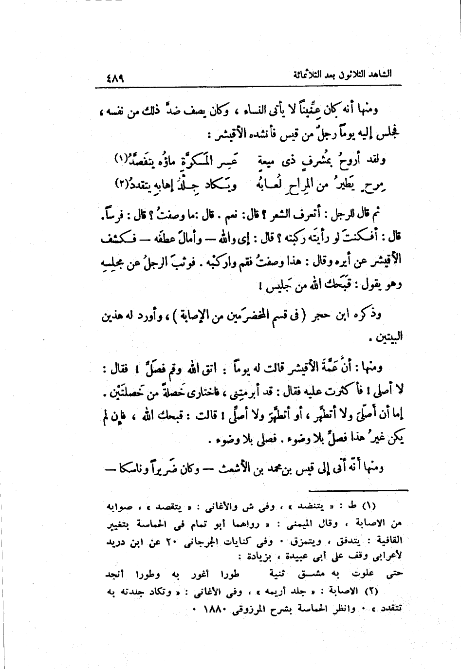 وَمِنْهَا أنّه كَانَ عنّيناً لَا يَأْتِي النِّسَاء وَكَانَ يصف ضدّ ذَلِك من نَفسه فَجَلَسَ إِلَيْهِ يَوْمًا رجلٌ من قيس فأنشده الأقيشر: الْكَامِل