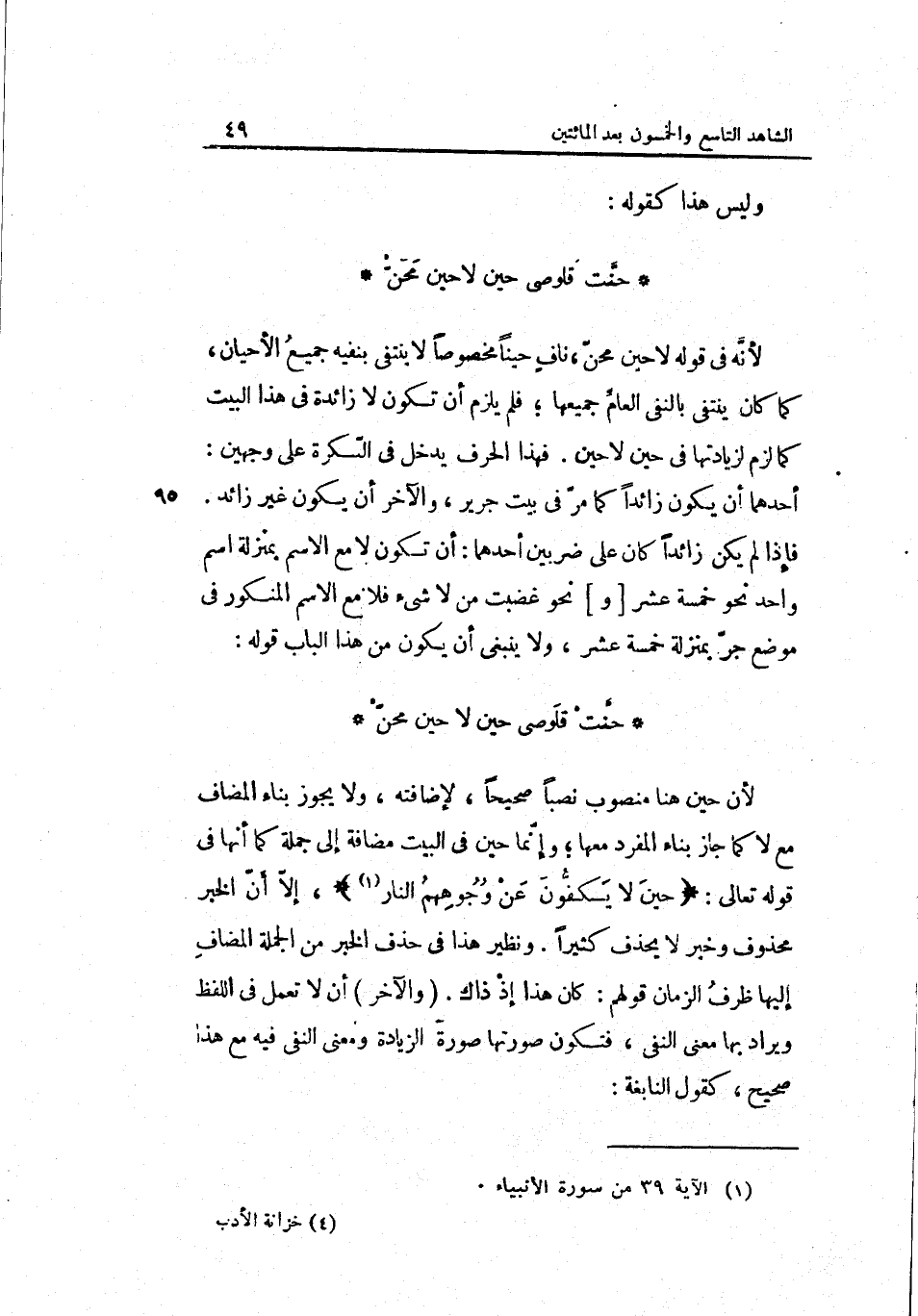 حنّت قلوصي حِين لَا حِين محن لأنّه فِي قَوْله لَا حِين محن نافٍ حينا مَخْصُوصًا لَا يَنْتَفِي بنفيه جَمِيع الأحيان كَمَا كَانَ يَنْتَفِي بِالنَّفْيِ العامّ جَمِيعهَا فَلم يلْزم أَن تكون لَا زَائِدَة فِي هَذَا الْبَيْت كَمَا لزم لزيادتها فِي حِين لَا حِين.