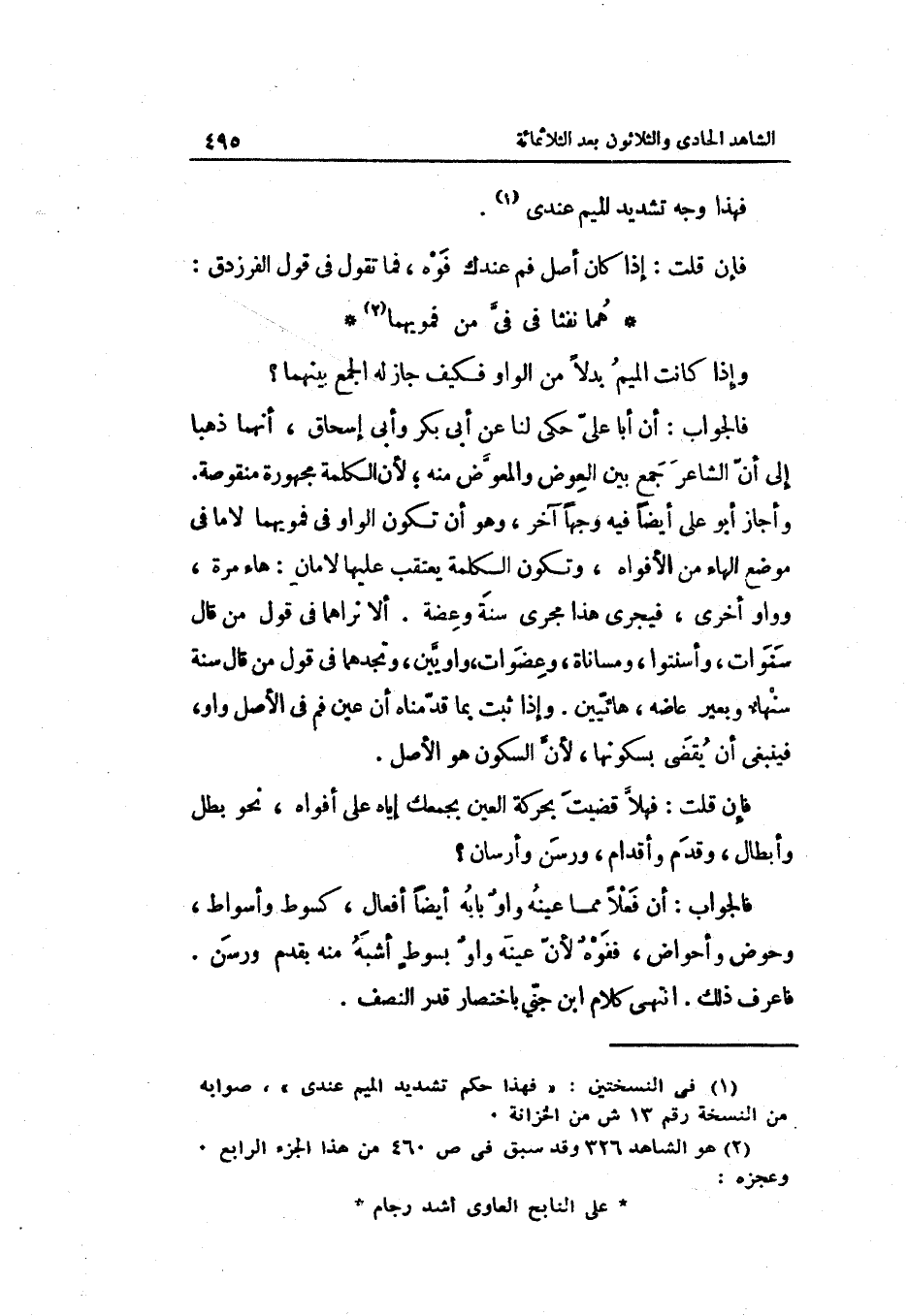 فَإِن قلت: إِذا كَانَ أصل فَم عنْدك فوه فَمَا تَقول فِي قَول الفرزدق: هما نفثا فِي فيّ من فمويهما وَإِذا كَانَت الْمِيم بَدَلا من الْوَاو فَكيف جَازَ لَهُ الْجمع بَينهمَا فَالْجَوَاب: أَن أيا عليّ حكى لنا عَن أبي بكر وَأبي إِسْحَاق أَنَّهُمَا ذَهَبا إِلَى أنّ الشَّاعِر جمع بَين الْعِوَض والمعوّ مِنْهُ لأنّالكلمة مجهورة منقوصة.