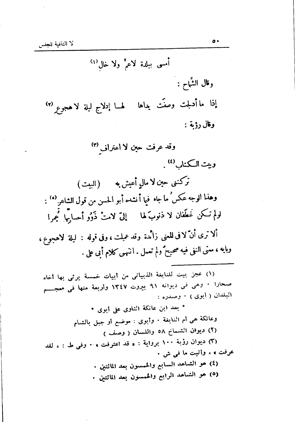 أَلا ترى أنّ لَا فِي الْمَعْنى زَائِدَة وَقد عملت وَفِي قَوْله: لَيْلَة لَا هجوع وبابه معنى النَّفْي فِيهِ صحيحٌ وَلم تعْمل انْتهى كَلَام أبي عليّ.)