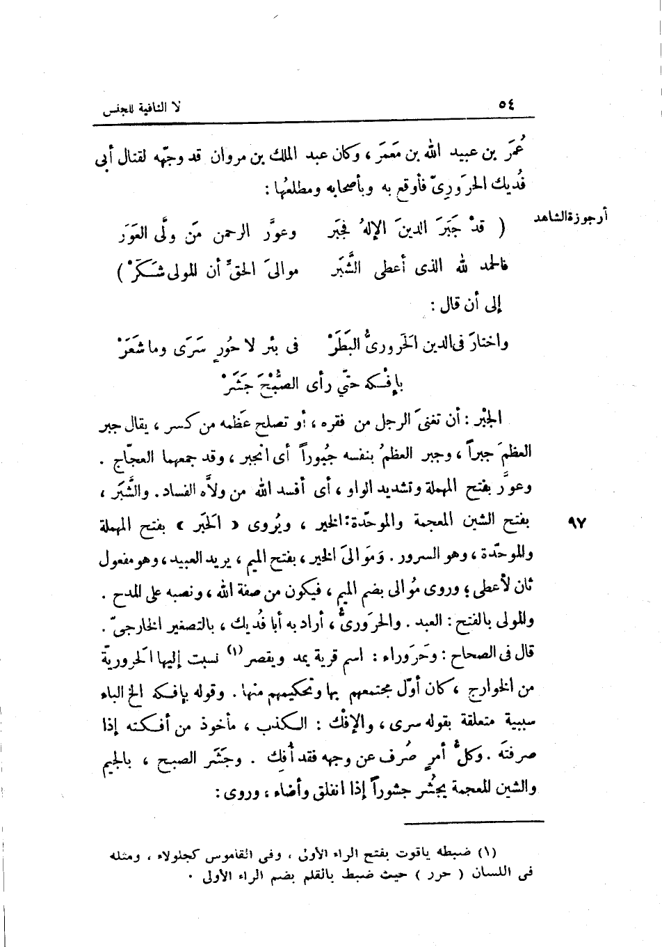 بإفكه حتّى رأى الصبّح جشر الْجَبْر: أَن تغني الرجل من فقره أَو تصلح عظمه من كسر يُقَال: جبر الْعظم جبرا وجبر الْعظم بِنَفسِهِ جبوراً أَي: انجبر وَقد جَمعهمَا العجّاج. وعوّر بِفَتْح الْمُهْملَة وَتَشْديد الْوَاو أَي: أفسد الله من ولاّه الْفساد. والشّبر: بِفَتْح الشين الْمُعْجَمَة والموحّدة الْخَيْر ويروى الحبر: بِفَتْح الْمُهْملَة والموحّدة وَهُوَ السرُور. وموالي الْخَيْر بِفَتْح الْمِيم يُرِيد العبيد وَهُوَ مفعول ثَان لأعطى وَرُوِيَ موَالِي بِضَم الْمِيم فَيكون من صفة الله ونصبه على الْمَدْح. والْمولى بِالْفَتْح: العَبْد. والحروريّ أَرَادَ بِهِ أَبَا فديك بِالتَّصْغِيرِ الخارجيّ.