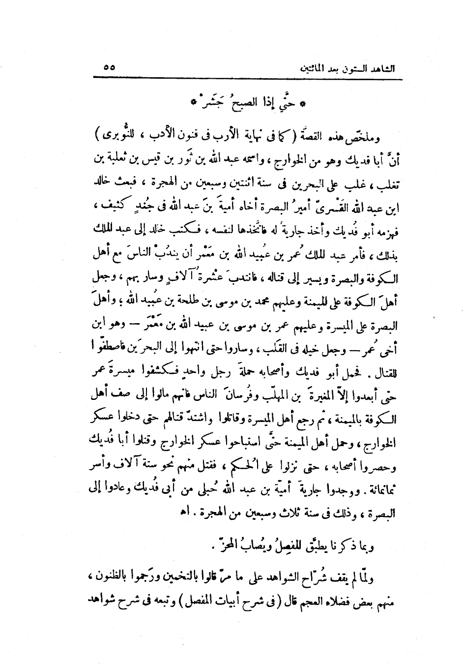 حتّى إِذا الصبّح جشر وملخّص هَذِه القصّة كَمَا فِي نِهَايَة الأرب فِي فنون الْأَدَب للنّويريّ أنّ أَبَا فديك وَهُوَ من الْخَوَارِج واسْمه عبد الله بن ثَوْر بن قيس بن ثَعْلَبَة بن تغلب غلب على الْبَحْرين فِي سنة اثْنَتَيْنِ وَسبعين من الْهِجْرَة فَبعث خَالِد بن عبد الله القسريّ أَمِير الْبَصْرَة أَخَاهُ أُميَّة بن عبد الله فِي جندٍ كثيف فَهَزَمَهُ أَبُو فديك وَأخذ جاريةٍ لَهُ فاتّخذها لنَفسِهِ فَكتب خَالِد إِلَى عبد الْملك بذلك فَأمر عبد الْملك عمر بن عبيد الله بن معمر أَن ينْدب النّاس مَعَ أهل الْكُوفَة وَالْبَصْرَة ويسير إِلَى قِتَاله فَانْتدبَ عشرَة آلَاف وَسَار بهم.