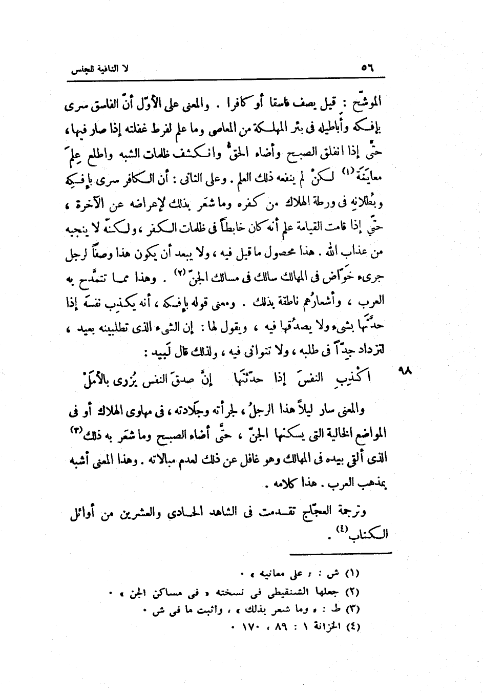 وعَلى الثَّانِي: أَن الْكَافِر سرى بإفكه وبطلانه فِي ورطة الْهَلَاك من كفره وَمَا شعر بذلك لإعراضه عَن الْآخِرَة حتّى إِذا قَامَت الْقِيَامَة علم أَنه كَانَ خابطاً فِي ظلمات الْكفْر وَلكنه لَا خوّاض فِي المهالك سالك فِي مسالك الجنّ. وَهَذَا مّما تتمدّح بِهِ الْعَرَب وأشعارهم ناطقة بذلك. وَمعنى قَوْله: بإفكه أَنه يكذب نَفسه إِذا حدّثها بِشَيْء وَلَا يصدقها فِيهِ وَيَقُول لَهَا: إِن الشَّيْء الَّذِي تطلبينه بعيد لتزداد جدّاً فِي طلبه وَلَا تتوانى فِيهِ ولذاك قَالَ لبيد: الرمل