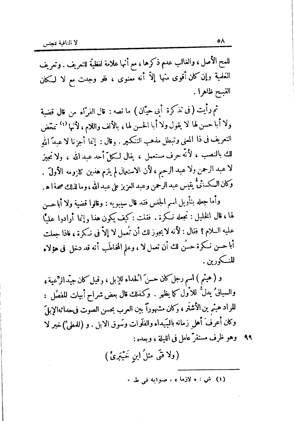 وَأما جعله بِتَأْوِيل اسْم الْجِنْس فقد قَالَ سِيبَوَيْهٍ: وَقَالُوا قَضِيَّة وَلَا أَبَا حسن لَهَا قَالَ الْخَلِيل: نجعله نكرَة. فَقلت: كَيفَ يكون هَذَا وإنّما أَرَادوا عليّاً عَلَيْهِ السَّلَام فَقَالَ: لأنّه لَا يجوز لَك أَن تعْمل لَا إلاّ فِي نكرَة فَإِذا جعلت أَبَا حسن نكرَة حسن لَك أَن تعْمل لَا وَعلم الْمُخَاطب أنّه قد دخل فِي هَؤُلَاءِ المنكورين. وهَيْثَم اسْم رجل كَانَ حسن الحداء لِلْإِبِلِ وَقيل كَانَ جيّد الرّعية والسياق يدلّ للأوّل كَمَا)