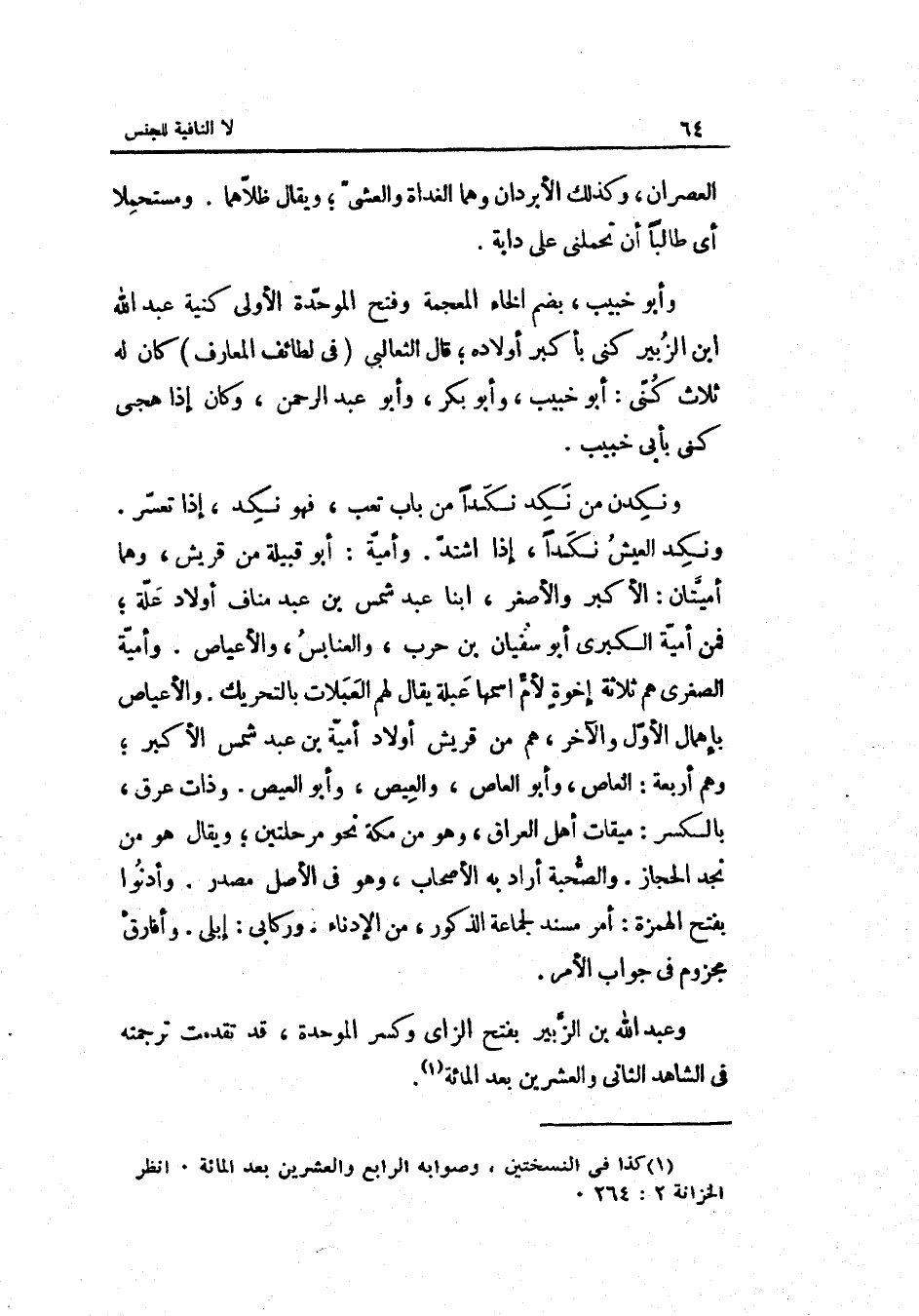 ونكدن من نكد نكداً من بَاب تَعب فَهُوَ نكد إِذا تعسّر. ونكد الْعَيْش نكداً إِذا اشتدّ. وأميّة: أَبُو قَبيلَة من قُرَيْش وهما أميّتان: الْأَكْبَر والأصغر ابْنا عبد شمس بن عبد منَاف أَوْلَاد علّة فَمن أميّة الْكُبْرَى أَبُو سُفْيَان بن حَرْب والعنابس والأعياص. وأميّة الصُّغْرَى هم ثَلَاثَة إخْوَة لأمٍّ اسْمهَا عبلة يُقَال لَهُم العبلات بِالتَّحْرِيكِ. والأعياص بإهمال الأوّل وَالْآخر هم من قُرَيْش أَوْلَاد أميّة ابْن عبد شمس الْأَكْبَر وهم أَرْبَعَة: الْعَاصِ وَأَبُو الْعَاصِ والعيص وَأَبُو الْعيص. وذَات عرق بِالْكَسْرِ: مِيقَات أهل الْعرَاق وَهُوَ من مكّة نَحْو مرحلَتَيْنِ وَيُقَال هُوَ من نجد الْحجاز. والصّحبة أَرَادَ بِهِ الْأَصْحَاب وَهُوَ فِي الأَصْل مصدر. وادنوا بِفَتْح الْهمزَة: أَمر مُسْند لجَماعَة الذُّكُور من الإدناء وركابي: إبلي. وأفارق مجزوم فِي جَوَاب الْأَمر. وَعبد الله بن الزّبير بِفَتْح الزَّاي وَكسر الْمُوَحدَة قد تقدّمت تَرْجَمته فِي الشَّاهِد الرَّابِع وَالْعِشْرين بعد الْمِائَة.