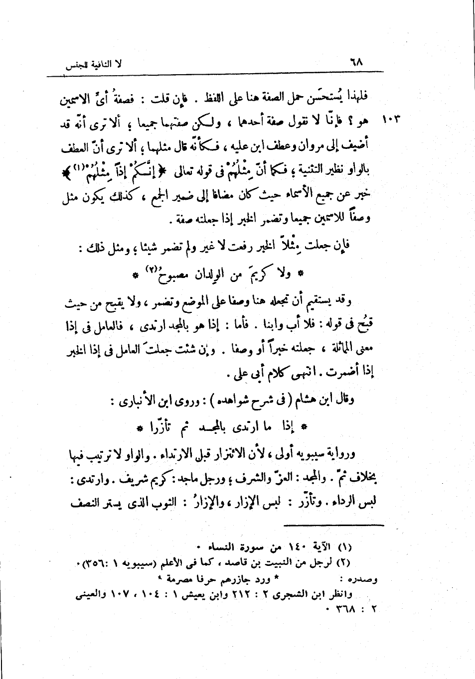 وَقَالَ ابْن هِشَام فِي شرح شواهده: وروى ابْن الأنباريّ: إِذا مَا ارتدى بالمجد ثمَّ تأزّرا وَرِوَايَة سِيبَوَيْهٍ أولى لِأَن الائتزار قبل الارتداء. وَالْوَاو لَا تَرْتِيب فِيهَا بِخِلَاف ثمّ والْمجد: العزّ والشرّف وَرجل ماجد: كريم شرِيف. وارتدى: لبس الرِّدَاء. وتأزّر: لبس الْإِزَار: الثّوب الَّذِي يستر النّصْف