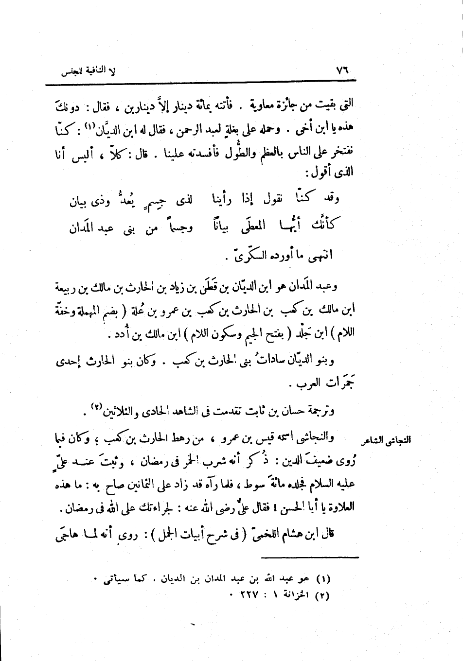 وترجمة حسّان بن ثَابت تقدّمت فِي الشَّاهِد الْحَادِي وَالثَّلَاثِينَ. والنَّجَاشِيّ اسْمه قيس بن عَمْرو من رَهْط الْحَارِث بن كَعْب وَكَانَ فِيمَا رُوِيَ ضَعِيف الدَّين: ذكر أَنه شرب الْخمر فِي رَمَضَان وَثَبت خَبره عِنْد عليّ عَلَيْهِ السَّلَام فجلده مائَة سوطٍ فلمّا رَآهُ قد زَاد على الثَّمَانِينَ صَاح بِهِ: مَا هَذِه العلاوة يَا أَبَا الْحسن فَقَالَ عليّ رَضِيَ اللَّهُ عَنْه: لجراءتك على الله فِي رَمَضَان.