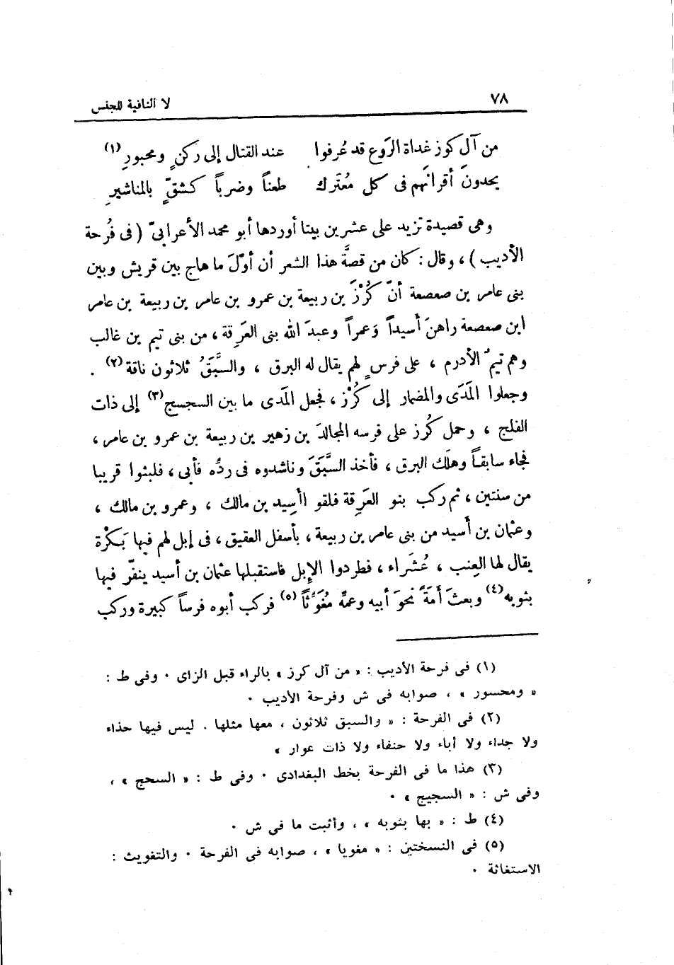 وَهِي قصيدة تزيد على عشْرين بَيْتا أوردهَا أَبُو مُحَمَّد الأعرابيّ فِي فرحة الأديب وَقَالَ: كَانَ من قصّة هَذَا الشّعْر أنّ أوّل مَا هاج بَين قُرَيْش وَبَين بني عَامر ابْن صعصعة أَن كرز بن ربيعَة بن عَمْرو بن عَامر بن ربيعَة بن عَامر بن صعصعة رَاهن أسيداً وعمراً وَعبد الله بني العرقة من بني تيم بن غَالب وهم تيمٌ الأدرم على فرسٍ لَهُم يُقَال لَهُ الْبَرْق والسّبق ثَلَاثُونَ نَاقَة.