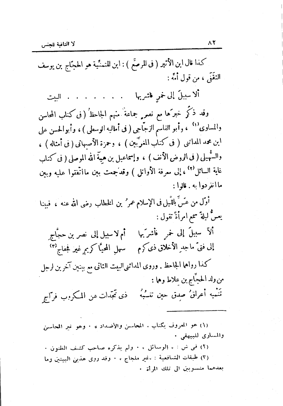 (أَلا سَبِيل إِلَى خمرٍ فأشربها ... أم لَا سَبِيل إِلَى نصر بن حجّاج)