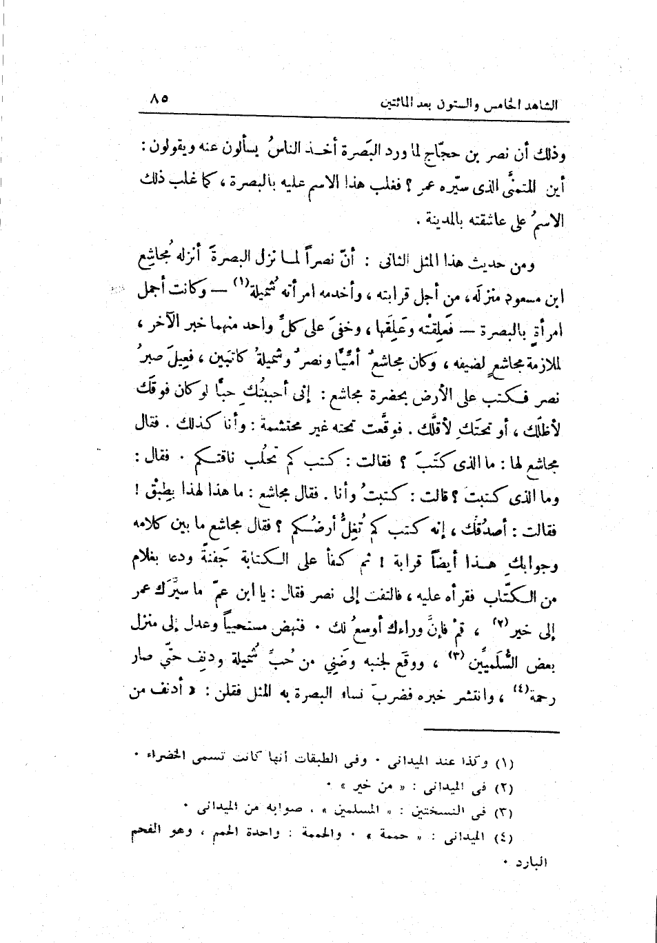 وَمن حَدِيث هَذَا الْمثل الثَّانِي: أنّ نصرا لما نزل الْبَصْرَة أنزلهُ مجاشع بن مَسْعُود منزله من أجل قرَابَته وأخدمه امْرَأَته شميلة وَكَانَت أجمل امرأةٍ بِالْبَصْرَةِ فعلقته وعلقها وخفي على كلّ وَاحِد مِنْهُمَا خبر الآخر لملازمة مجاشع لضيفه وَكَانَ مجاشعٌ أميّاً ونصرٌ وشميلة كاتبين فعيل صَبر نصر فَكتب على الأَرْض بِحَضْرَة مجاشع: إنّي أحببتك حبّاً لَو كَانَ فَوْقك لأظلّك أَو تَحْتك لأقلك. فَوَقَعت تَحْتَهُ غير محتشمة: وَأَنا كَذَلِك. فَقَالَ مجاشع لَهَا: مَا الَّذِي كتب فَقَالَت: كتب كم تحلب ناقتكم. فَقَالَ: وَمَا الَّذِي كتبت قَالَت: كتبت وَأَنا. فَقَالَ مجاشع: مَا هَذَا لهَذَا بطبق فَقَالَت: أصدقك إنّه كتب كم تغلّ أَرْضكُم. فَقَالَ مجاشع مَا بَين كَلَامه وجوابك هَذَا أَيْضا قرَابَة ثمَّ كفأ على الْكِتَابَة جَفْنَة ودعا بِغُلَام من الكتّاب فقرأه عَلَيْهِ فَالْتَفت إِلَى نصر فَقَالَ: يَا ابْن عمّ مَا سيّرك عمر إِلَى خير قُم فإنّ وَرَاءَك أوسع لَك. فَنَهَضَ مستحيياً وَعدل إِلَى منزل بعض السّلمييّن وَوَقع لجنبه وضني