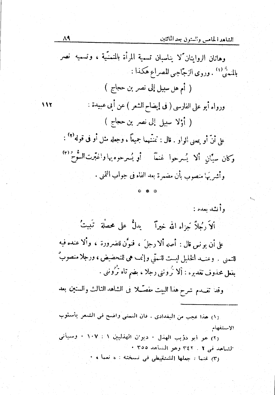 وَهَاتَانِ الرّوايتان لَا يناسبان تَسْمِيَة الْمَرْأَة بالمتمنّية وَتَسْمِيَة نصر بالمتمنّى. وروى الزّجاجيّ المصراع هَكَذَا: أم هَل سَبِيل إِلَى نصر بن حجّاج وَرَوَاهُ أَبُو عليّ الفارسيّ فِي إِيضَاح الشّعْر عَن أبي عُبَيْدَة: أَو لَا سَبِيل إِلَى نصر بن حجّاج
