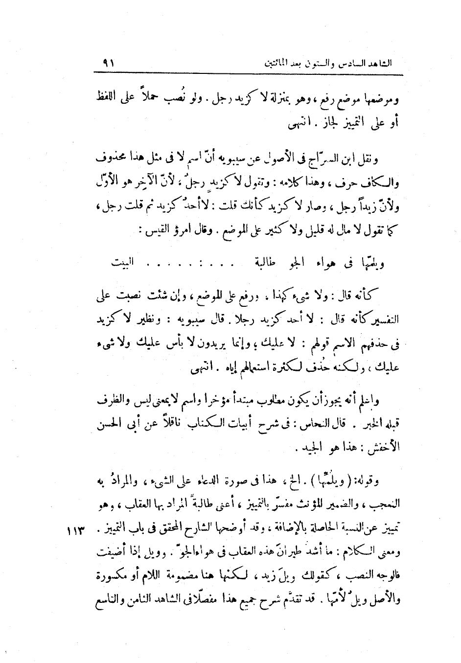 لَا مَال لَهُ قَلِيل وَلَا كثير على الْموضع. وَقَالَ امْرُؤ الْقَيْس: ويلمّها فِي هَوَاء الجوّ طالبة ... ... ... . . الْبَيْت كَأَنَّهُ قَالَ: وَلَا شَيْء كَهَذا وَرفع على الْموضع وَإِن شِئْت نصبت على التَّفْسِير كَأَنَّهُ قَالَ: لَا اُحْدُ كزيد رجلا.