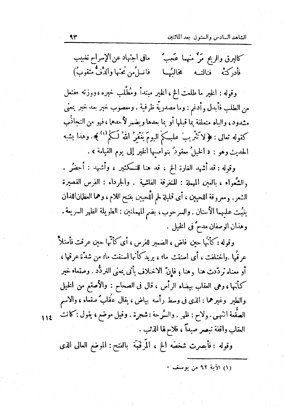 وَقَوله: قد اشْهَدْ الْغَارة الخ وقد هُنَا للتكثير وأشهد: أحضر. والشّعواء بِالْعينِ الْمُهْملَة: المتفرقة الفاشية. والجرداء: الْفرس القصيرة الشّعْر. ومَعْرُوفَة اللحيين أَي: قَليلَة لحم اللّحيين بِفَتْح اللَّام وهما العظمان اللَّذَان ينْبت عَلَيْهِمَا الْأَسْنَان. والسرحوب بِضَم الْمُهْمَلَتَيْنِ: الطَّوِيلَة الظّهْر السريعة. وَهَذَا الوصفان مدحٌ فِي الْخَيل.