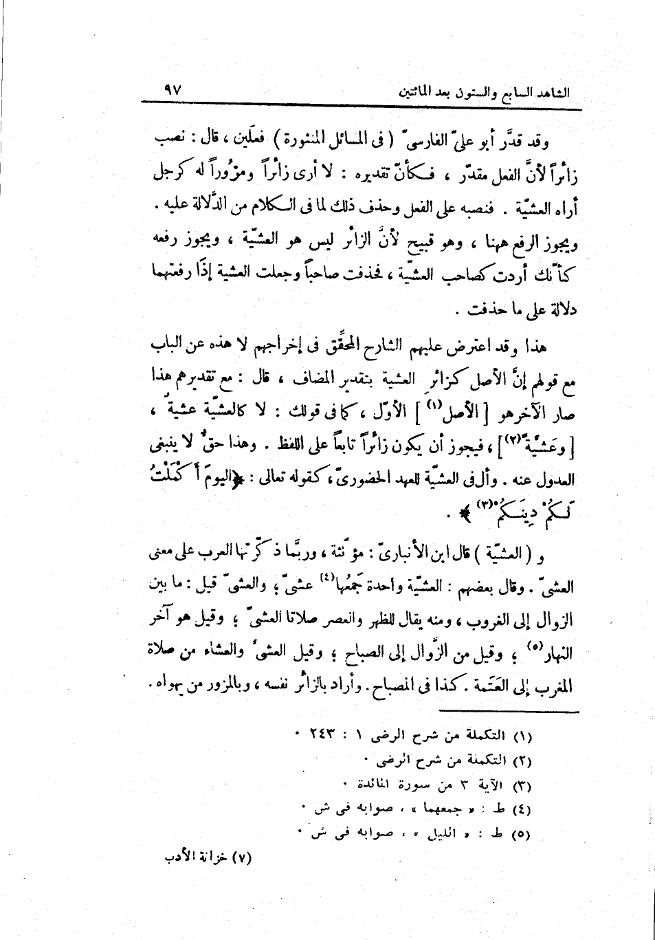 هَذَا وَقد اعْترض عَلَيْهِم الشَّارِح المحقّق فِي إخراجهم لَا هَذِه عَن الْبَاب مَعَ قَوْلهم إنّ الأَصْل كزائر العشيّة بِتَقْدِير الْمُضَاف قَالَ: مَعَ تقديرهم هَذَا صَار الآخر هُوَ الأَصْل الأوّل كَمَا فِي قَوْلك: لَا كالعشيّة عشيّةٌ وعشيّةً فَيجوز أَن يكون زَائِرًا تَابعا على اللَّفْظ. وَهَذَا حقّ لَا يَنْبَغِي الْعُدُول عَنهُ وأل فِي العشيّة للْعهد الحضوريّ كَقَوْلِه تَعَالَى: الْيَوْم أكملت لكم دينكُمْ والعشيّة قَالَ ابْن الأنباريّ: مؤنّثة وربّما دكّرتها الْعَرَب على معنى العشيّ.